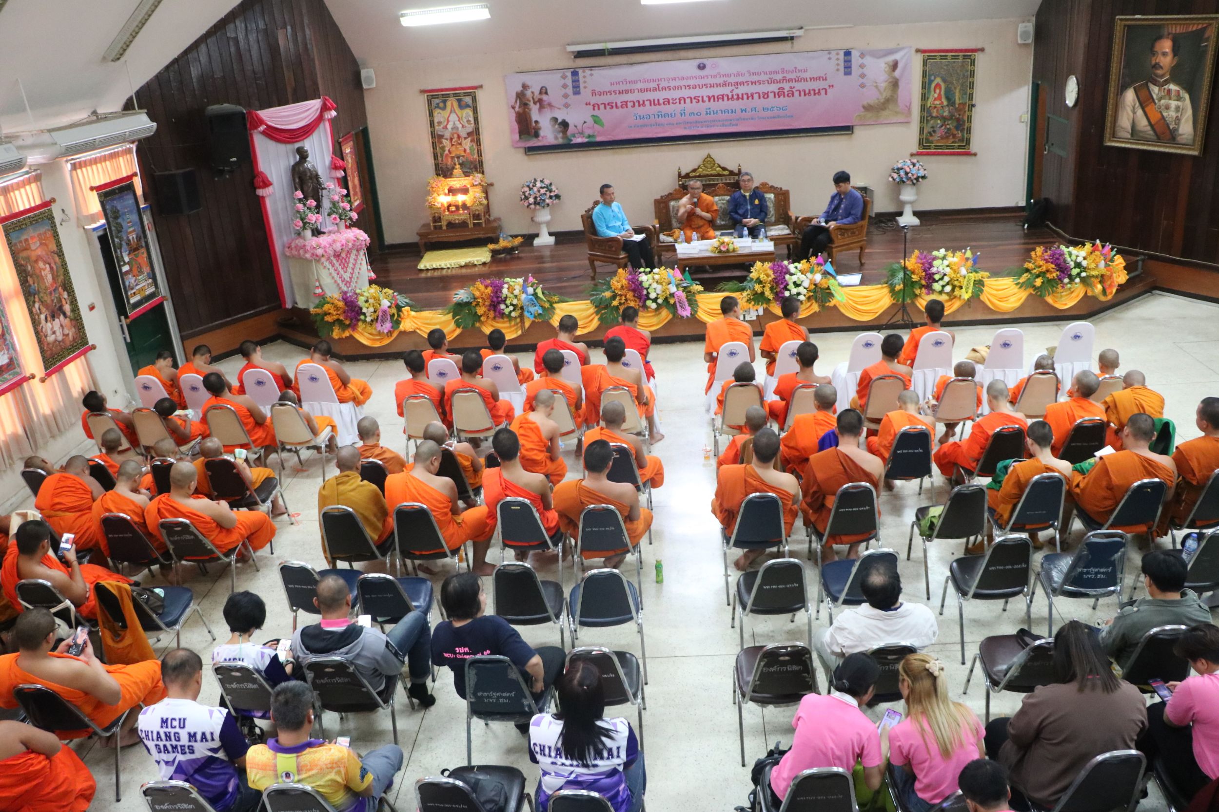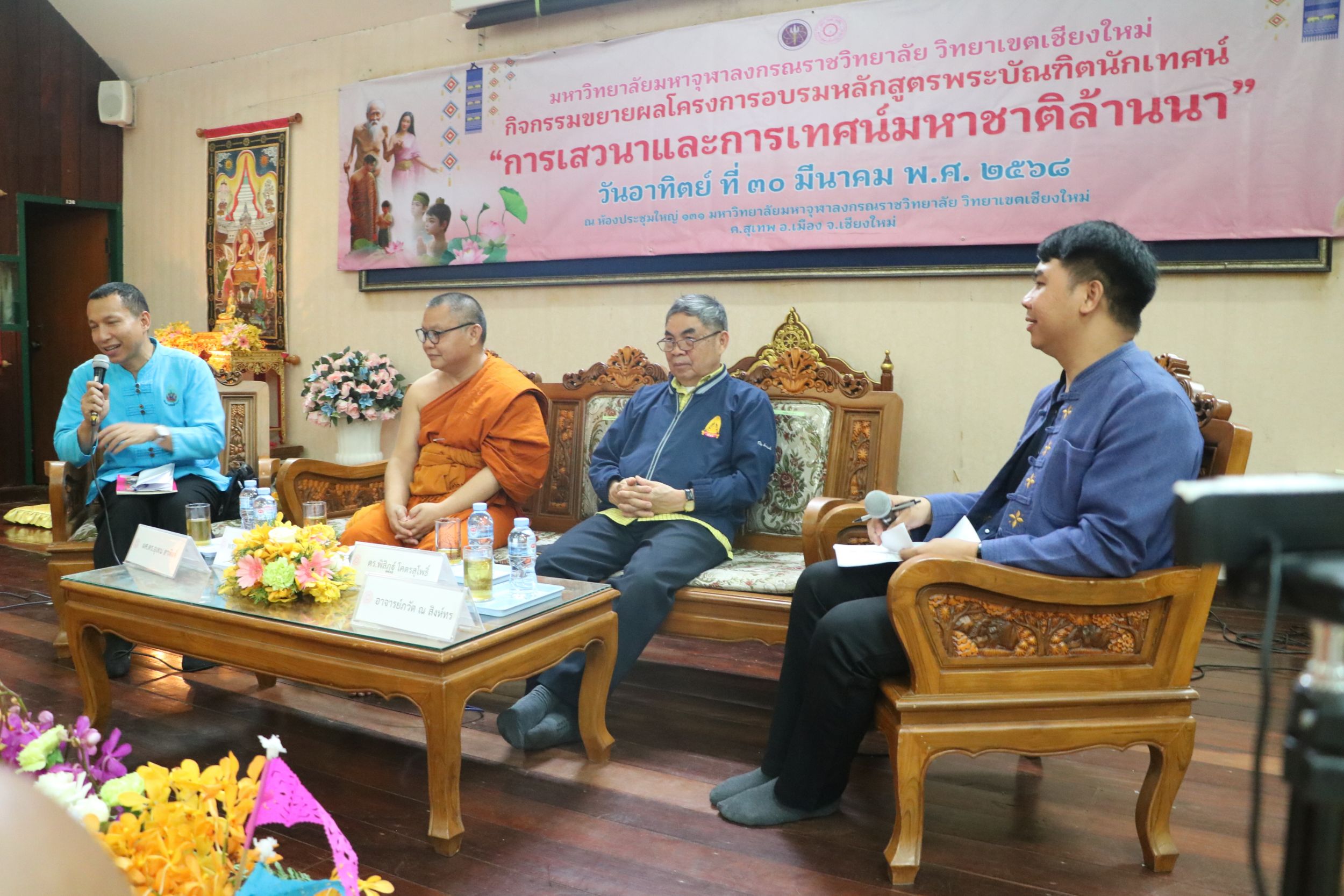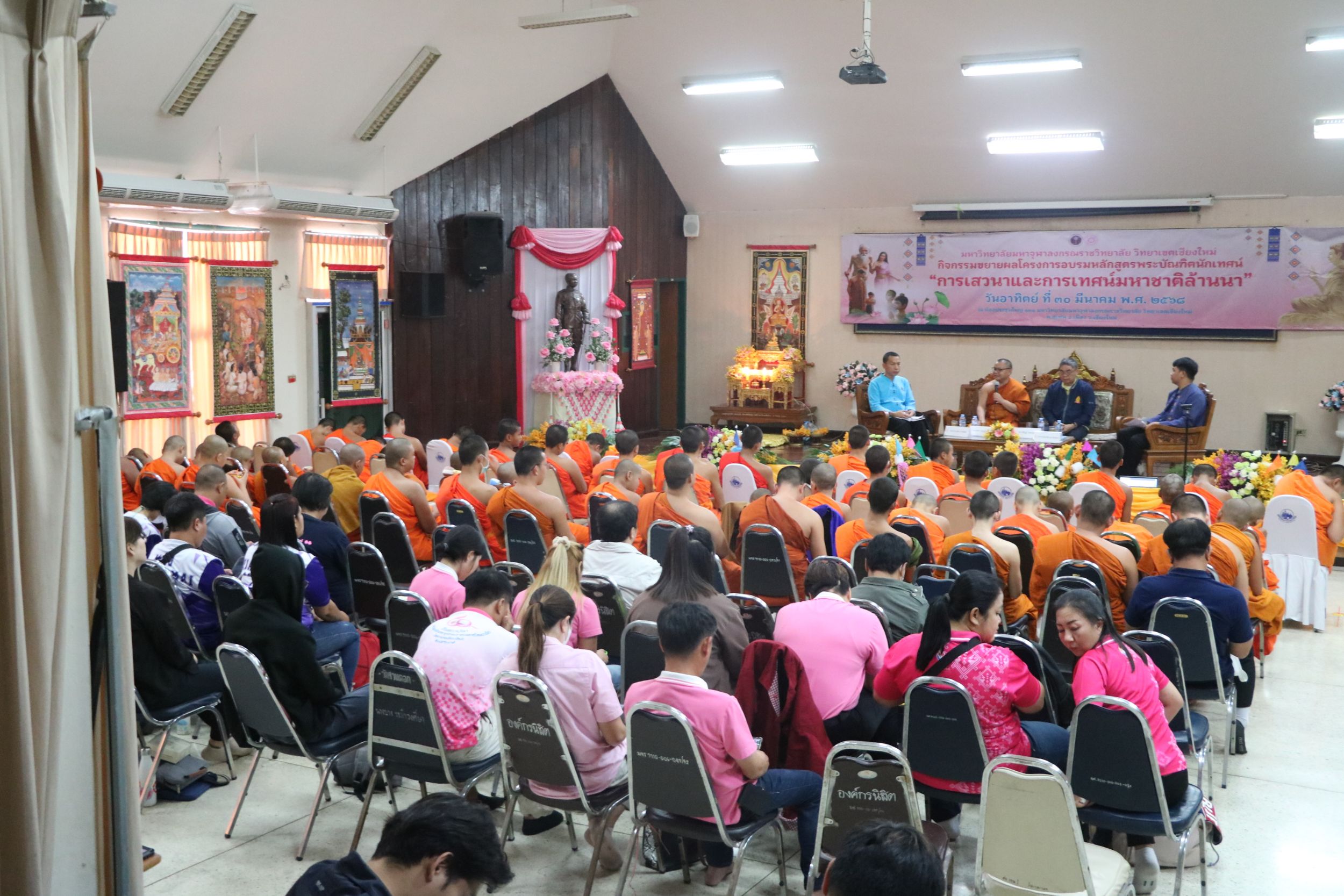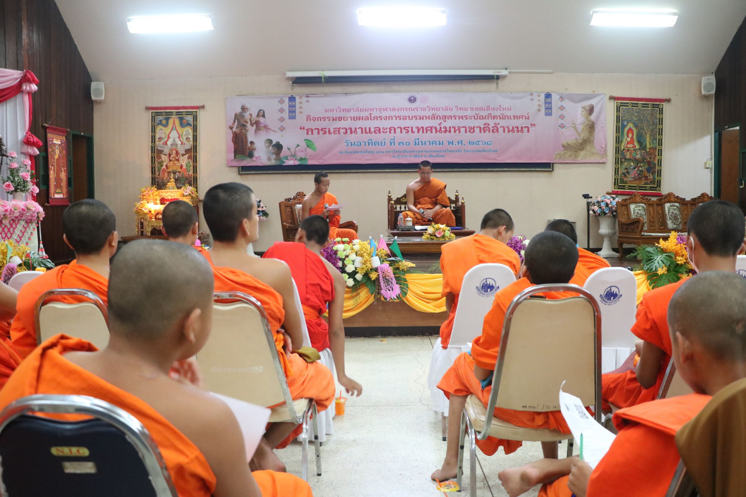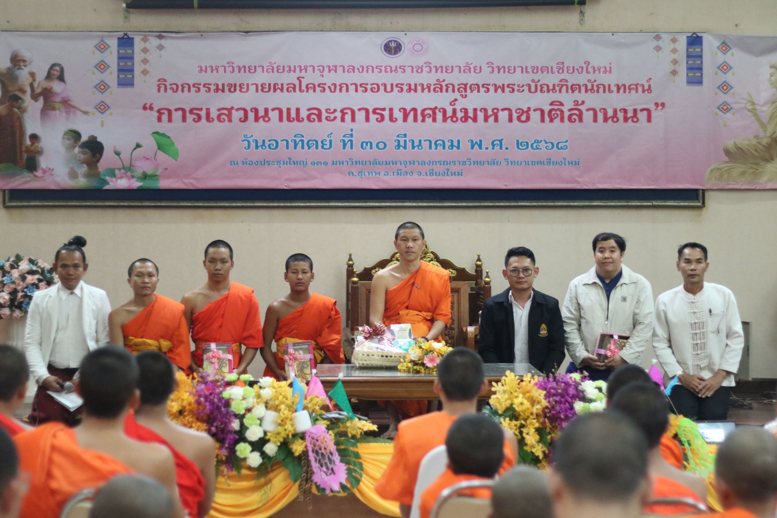 เมื่อวันอาทิตย์ที่ 30 มีนาคม 2568 พระสุธีวัชรบัณฑิต,ผศ.ดร. รองอธิการบดี วิทยาเขตเชียงใหม่ มอบหมายให้พระครูพิสุทธิชยานุศาสก์ ผู้ช่วยอธิการบดีฝายกิจการนิสิต เมตตาเป็นประธานกล่าวต้อนรับเครือข่ายร่วมงาน และกล่าวเปิดกิจกรรมขยายผลโครงการอบรมหลักสูตรพระบัณฑิตนักเทศน์ “การเสวนาและการเทศน์มหาชาติล้านนา” โดยดร.พระอธิวัฒน์ รตนวณฺโณณ อาจารย์บัณฑิตศึกษา เข้าถวายสักการะ ดร.อำนาจ ขัดวิขัย อาจารย์ระดับปริญญาตรี เข้าถวายสักการะ ดร.พิสิฏฐ์ โคตรสุโพธิ์ ผู้อำนวยการบัณฑิตศึกษา กล่าวถวายรายงาน และกล่าวปิดโครงการโดย พระครูใบฏีกาทิพย์พนากรณ์ ชยาภินนฺโท,ดร. ผู้อำนวยการสำนักวิชาการพร้อมมอบของที่ระลึกให้กับเครือข่ายที่เข้าร่วม ณ ห้องประชุมธรรมปัญญาบดี 131 มหาวิทยาลัยมหาจุฬาลงกรณราชวิทยาลัย วิทยาเขตเชียงใหม่ วัดสวนดอก ตำบลสุเทพ อำเภอเมืองเชียงใหม่ จังหวัดเชียงใหม่
