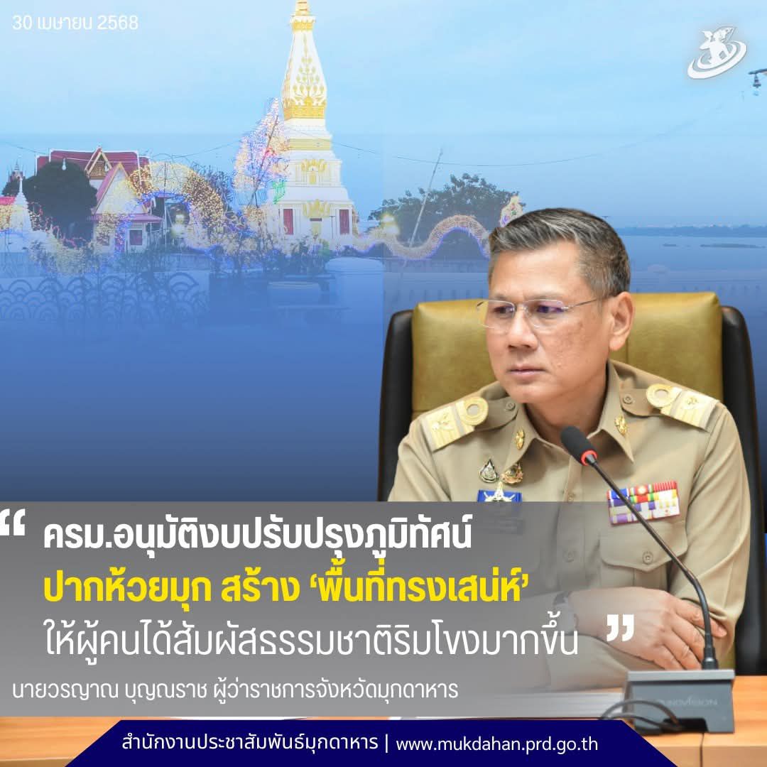 เมื่อวันที่ 30 เมษายน 2568เวลา 14.00 น. ที่ห้องประชุมแก่งกะเบา ชั้น 3 ศาลากลางจังหวัดมุกดาหาร นายวรญาณ บุญณราช ผู้ว่าราชการจังหวัดมุกดาหารชี้แจงเกี่ยวกับโครงการส่งเสริมการท่องเที่ยวตลาดและประชาสัมพันธ์กลุ่มจังหวัดสนุก (เที่ยวสนุก สุขสบาย) ปรับปรุงภูมิทัศน์ปากห้วยมุกและพื้นที่ต่อเนื่อง จะช่วยพัฒนาพื้นที่ริมแม่น้ำโขงให้เป็นแหล่งท่องเที่ยวใหม่ที่เชื่อมต่อกับตลาดอินโดจีน โดยโครงการมีแผนดำเนินการให้แล้วเสร็จภายในปีงบประมาณ 2568.
