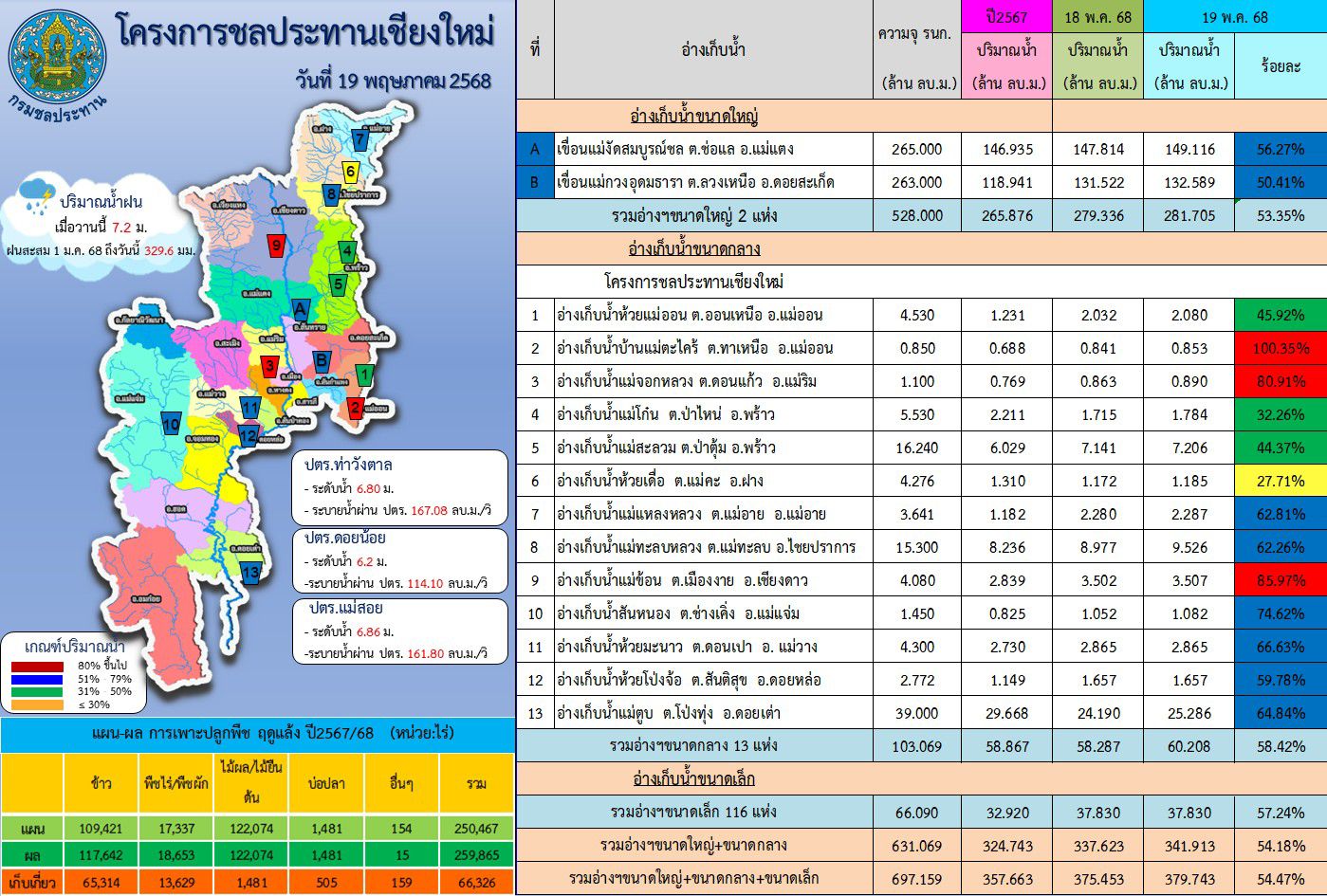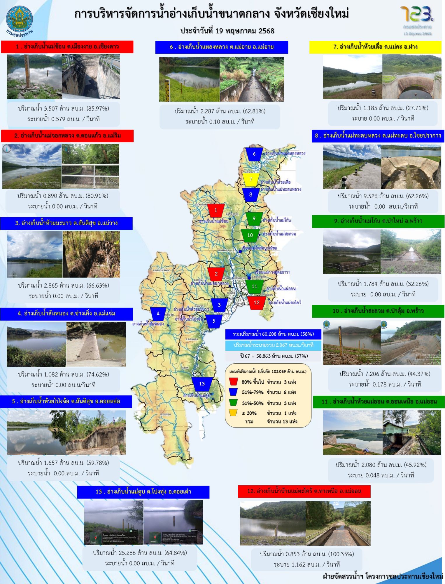 ส่วนอ่างเก็บน้ำขนาดเล็ก จำนวน 116 แห่ง มีปริมาณน้ำรวมอยู่ที่ 37 ล้าน ลบ.ม. คิดเป็นร้อยละ 57.24 เปอร์เซ็นต์ ก็มีพื้นที่ที่สามารถรองรับน้ำฝนได้อีก โดยทางศูนย์อุตุนิยมวิทยาภาคเหนือ ก็ได้คาดการณ์ว่าฝนในปีนี้ จะมีมากกว่าค่าเฉลี่ย 5 – 10 เปอร์เซ็นต์ ทางโครงการชลประทานเชียงใหม่ก็ได้มีการเตรียมความพร้อมไว้อย่างต่อเนื่อง