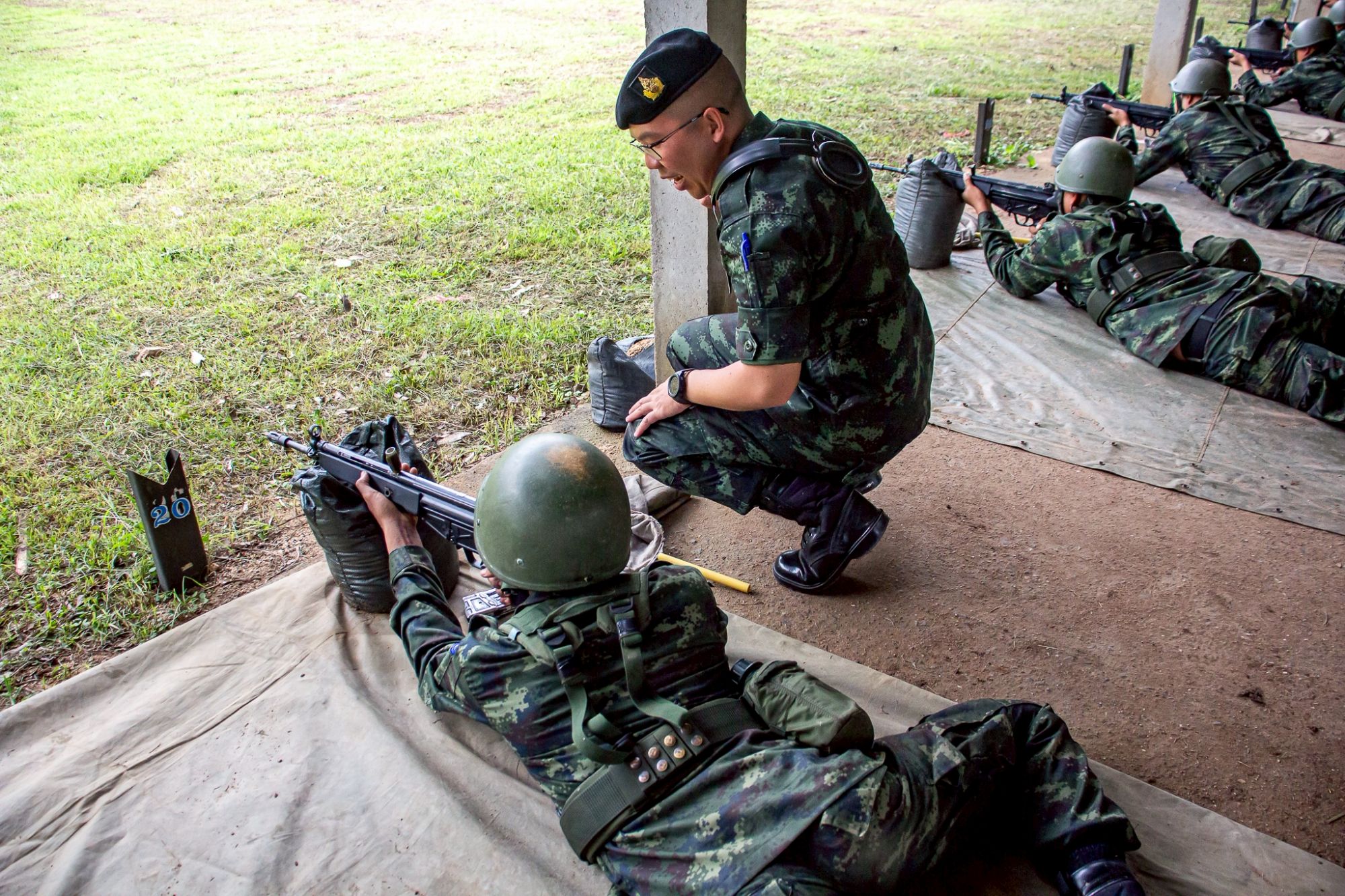 รองผู้บังคับกองพันมณฑลทหารบกที่ 33 ตรวจสอบการฝึกยิงปืนทหารใหม่ ผลัดที่ 1/68 ในการยิงปืนด้วยกระสุนจริง ครั้งแรก