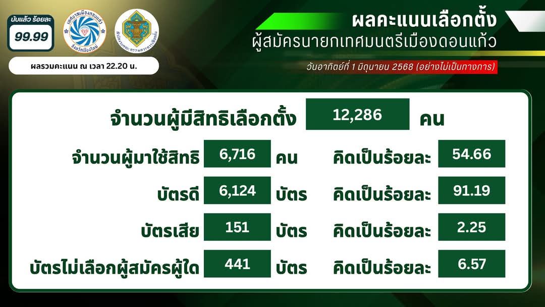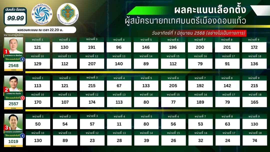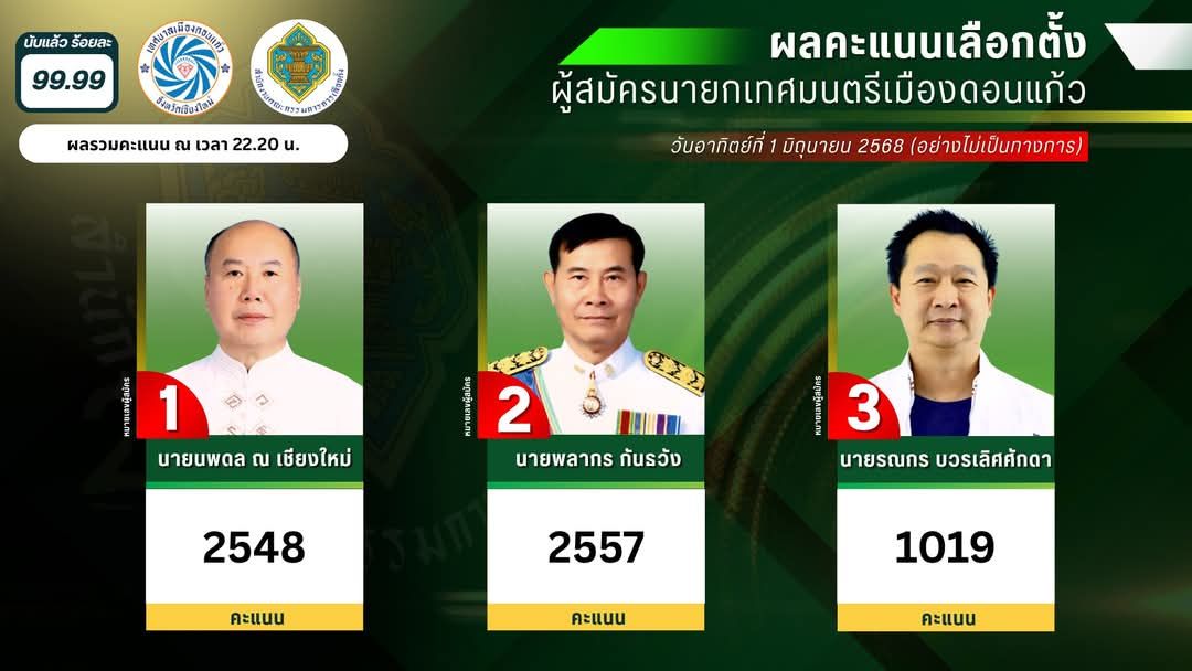 ผู้สมัครหน้าใหม่ หมายเลข 2 ล้มแชมป์นายกเทศมนตรีเทศบาลเมืองดอนแก้ว อำเภอแม่ริม จังหวัดเชียงใหม่ หลายสมัย ได้คะแนน 2,557 คะแนน ชนะไปแบบหายใจรดต้นคอ แค่ 9 คะแนน ส่วนอดีตนายกฯได้ 2548 คะแนน ทำให้ผู้สมัครหมายเลข 2 ได้นั่งเก้าอี้นายกเทศบาลเมืองดอนแก้วคนใหม่ พร้อมยกมือไหว้ขอบคุณทุกคะแนนเสียง ท่ามกลางผู้สนับสนุนมาให้กำลังใจล้นหลาม มอบพวงมาลัยแสดงความยินดี