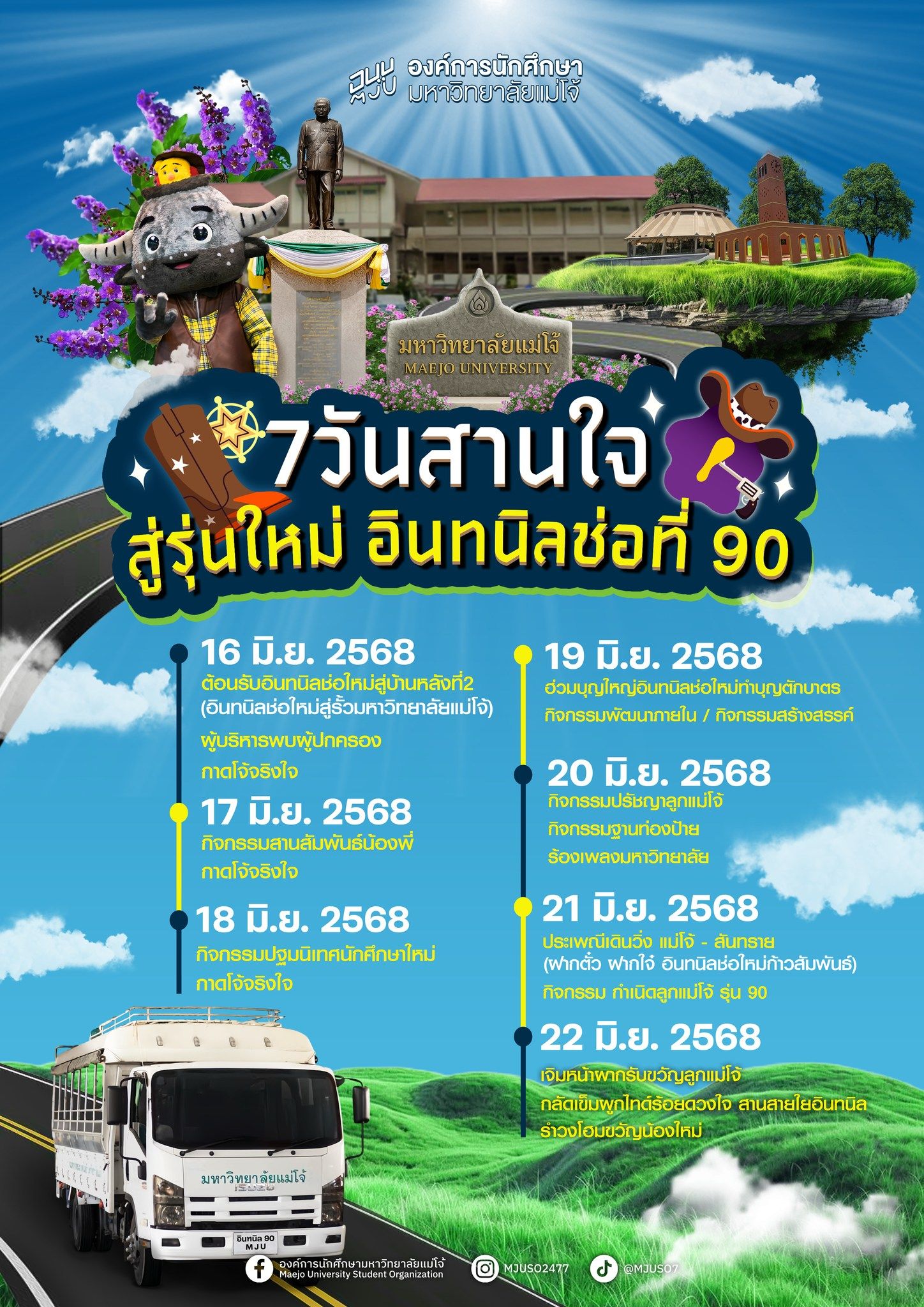 ปีการศึกษา 2568 นักศึกษาใหม่จากทั่วทุกสารทิศ รวมทั้งแม่โจ้-แพร่ฯ/แม่โจ้-ชุมพร จำนวนกว่า 5,500 คน กำลังจะก้าวเข้าสู่รั้วอินทนิล ในฐานะอินทนิลช่อที่ 90 ที่พร้อมจะเบ่งบานและเติบโตอย่างแข็งแกร่ง ซึ่งในปีนี้มหาวิทยาลัยแม่โจ้ ได้มีการจัดเตรียมกิจกรรมต่างๆ เพื่ออำนวยความสะดวก และเตรียมความพร้อมเสริมสร้างอัตลักษณ์ลูกแม่โจ้ หลากหลายกิจกรรม เริ่มตั้งแต่วันที่ 16 มิถุนายน 2568 มีรายละเอียดดังนี้