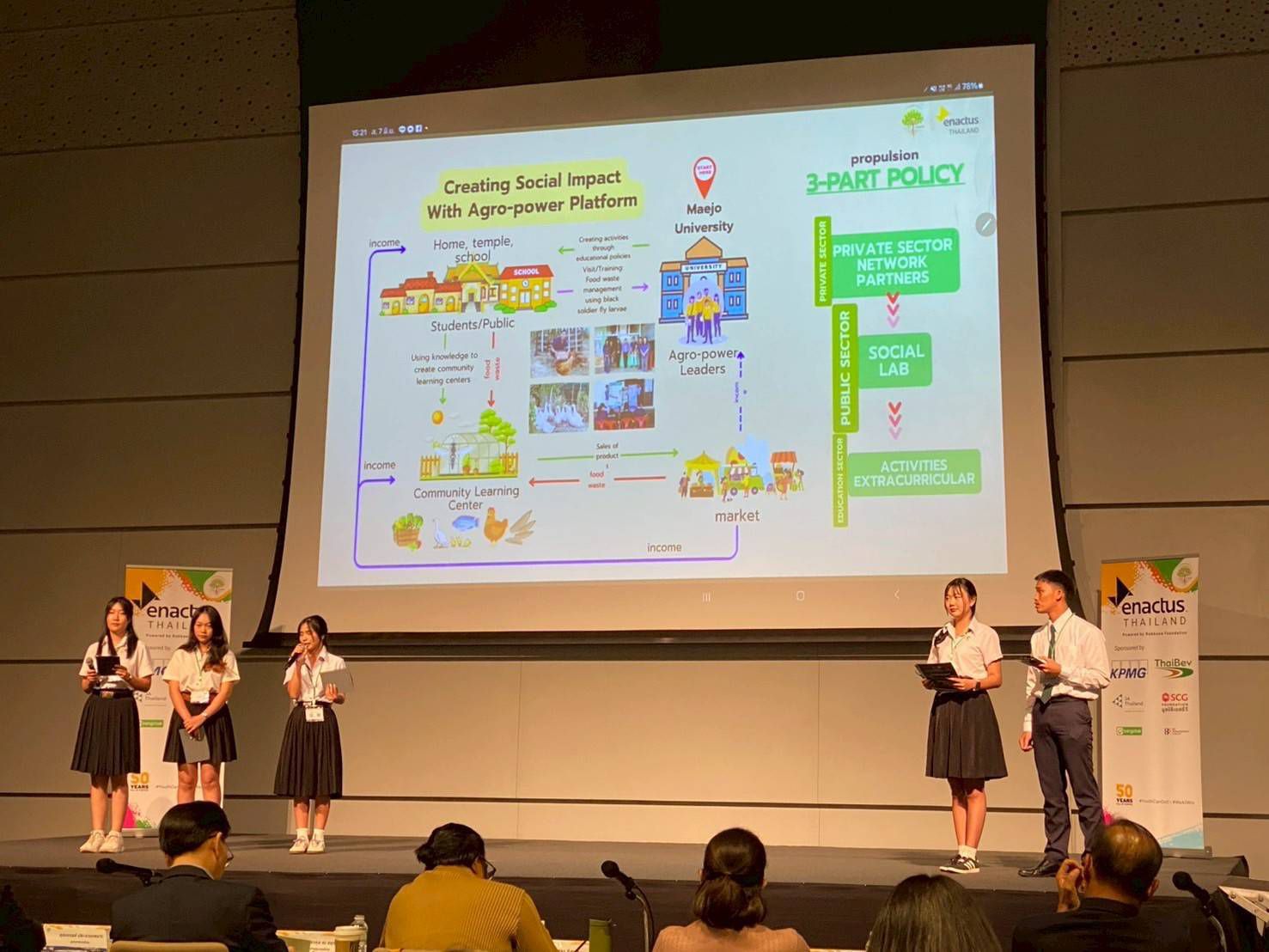 ทีม Agro-Power มหาวิทยาลัยแม่โจ้ นำเสนอผลงาน “พลังเกษตร เปลี่ยนขยะเศษอาหารเป็นทุนชีวิต” คว้ารองอันดับ 2 ระดับประเทศ รางวัลโครงการ Platinum จากเวที Rakkaew – Enactus Thailand National Exposition 2025 จัดโดย มูลนิธิรากแก้ว เพื่อเปิดโอกาสให้นิสิตนักศึกษาจากสถาบันการศึกษาทั่วประเทศได้แสดงผลของโครงการที่ได้ร่วมดำเนินงานกับชุมชน นำไปพัฒนาต่อยอดให้เกิดประโยชน์อย่างยั่งยืนกับชุมชนมากยิ่งขึ้น ซึ่งมีทีมจากสถาบันการศึกษาทั่วประเทศเข้าร่วมโครงการ 21 ทีม ระหว่างวันที่ 6-7 มิถุนายน 2568 ที่ผ่านมา ณ ศูนย์การค้าสามย่านมิตรทาวน์ กรุงเทพมหานคร