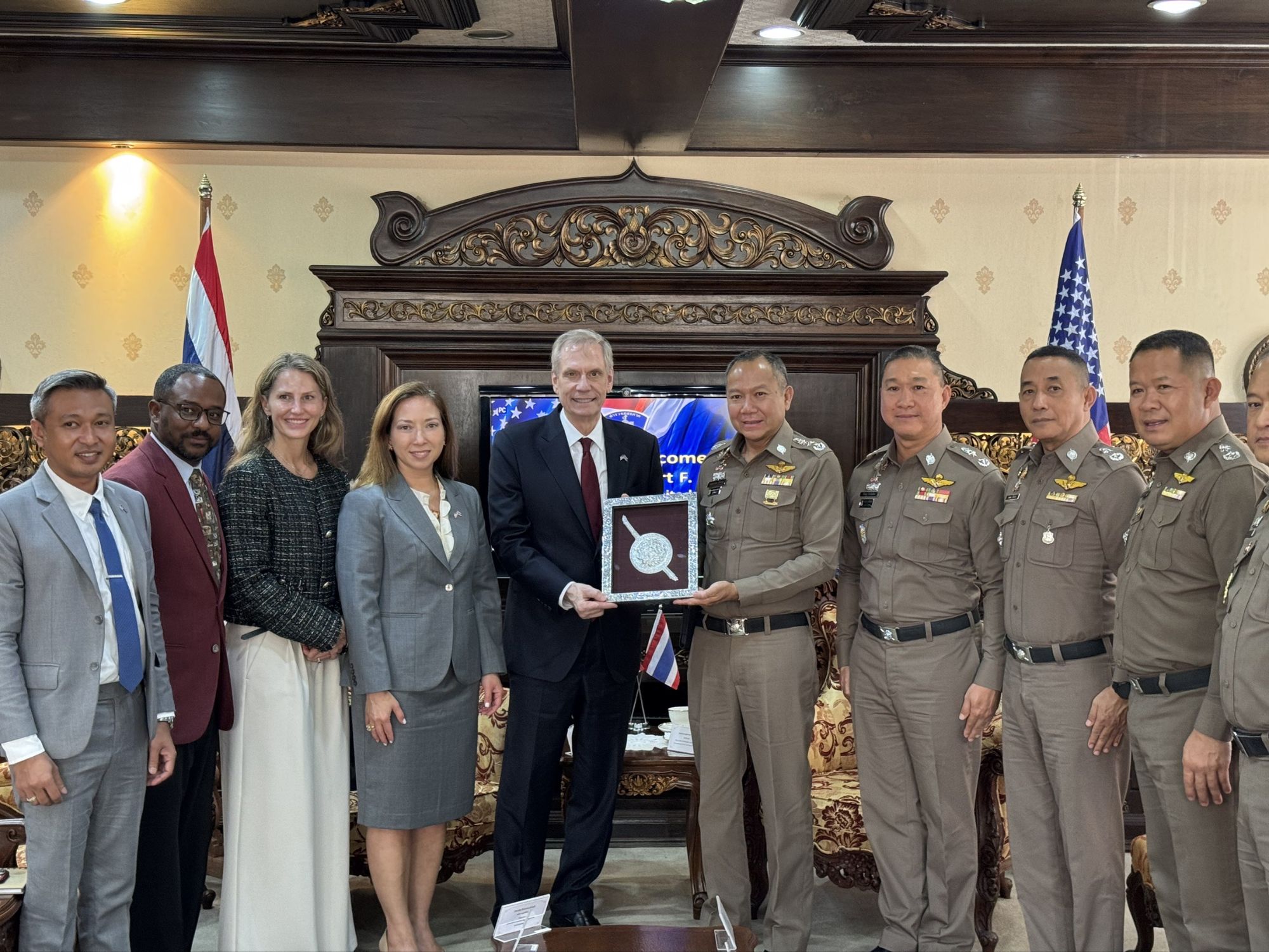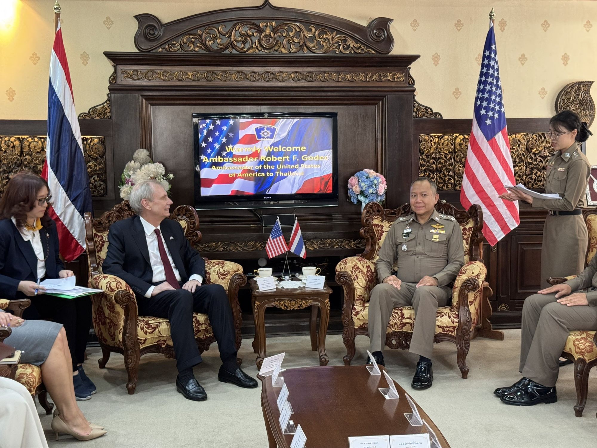 โดยได้หารือแลกเปลี่ยนความคิดเห็นและแสวงหาความร่วมมือด้านการปราบปรามอาชญากรรมแก๊ง Call Center, การปราบปรามยาเสพติด และอาชญากรรมข้ามชาติ, การแสวงหาประโยชน์จากเด็กและค้ามนุษย์ และการอำนวยความสะดวกในการดูแลบุคคลสัญชาติอเมริกา หรือบุคคลผู้ถือ 2 สัญชาติ ที่เป็นผู้เสียหาย ผู้ต้องหา หรือตายโดยผิดธรรมชาติ ให้เป็นไปตามนโยบายของ ตร.