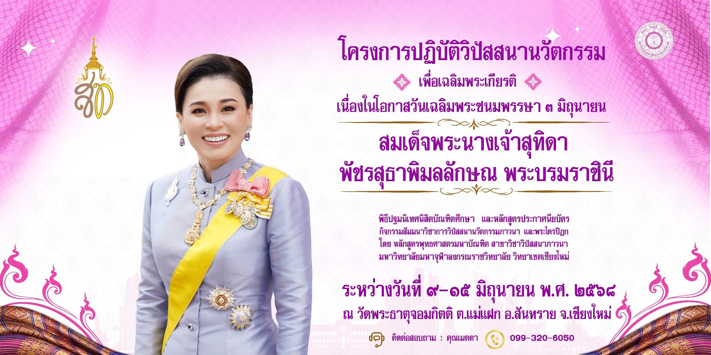 วันพฤหัสบดีที่ 12 มิถุนายน 2568 พระเดชพระคุณ พระเทพมังคลาจารย์ เจ้าคณะจังหวัดเชียงใหม่ เจ้าอาวาสวัดท่าตอน พระอารามหลวงเมตตามาเป็นประธานรับคัมภีร์ฯ ซึ่งนางสาวปิยะดาและนางสาวปรียาพร พลูทาจักร์ พร้อมนิสิตปริญญาโท สาขาวิปัสสนาภาวนารุ่นที่ 1 – 2 ถวายหลักสูตรฯ เพื่อเป็นข้อมูลให้นิสิตนักศึกษาในหลักสูตรวิปัสสนาและพระไตรปิฎกได้ค้นคว้าวิจัยพัฒนาตัวเองและสังคม โครงการปฏิบัติวิปัสสนานวัตกรรมเพื่อเฉลิมพระเกียรติ เนื่องในโอกาสวันเฉลิมพระชนมพรรษา ๓ มิถุนายน สมเด็จพระนางเจ้าสุทิดา พัชรสุธาพิมลลักษณ์ พระบรมราชินี ระหว่างวันที่ 9 – 15 มิถุนายน ๒๕๖๘ ในโอกาสเดียวกันได้เมตตาเป็นพระอุปัชฌาย์ นายอุดม ธนูสิทธิ์ ได้ฉายา อุตฺตมปญฺโญ แปว่า “ผู้มีความรู้สูงที่สุด” โดยมีญาติ สนิท มิตรสหาย เพื่อนๆ ร่วมพิธี ณ วัดพระธาตุจอมกิตติ ตำบลแม่แฝก อำเภอสันทราย จังหวัดเชียงใหม่.