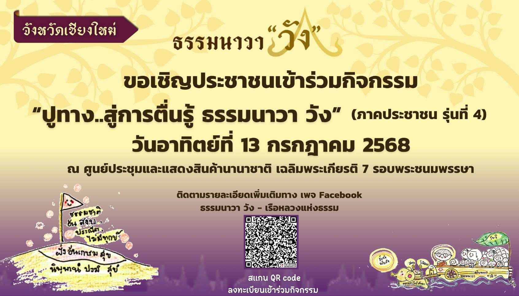 ขอเชิญชวนประชาชนลงทะเบียนสมัครเข้าร่วมโครงการ “ปูทาง สู่การตื่นรู้ ธรรมนาวา วัง” ภาคประชาชน รุ่นที่ 4 จังหวัดเชียงใหม่