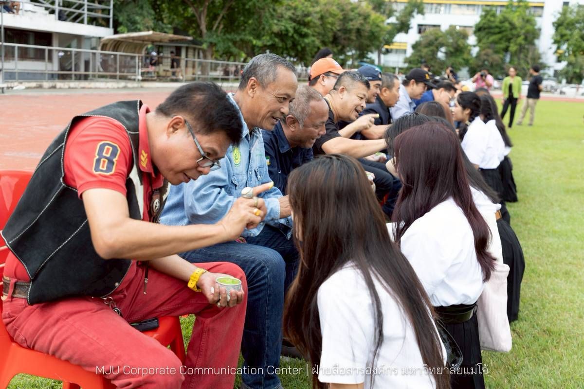 วันที่ 22 มิถุนายน 2568 มหาวิทยาลัยแม่โจ้ ร่วมกับ สมาคมศิษย์เก่าแม่โจ้ และองค์กรนักศึกษามหาวิทยาลัยแม่โจ้ จัดกิจกรรมรับขวัญน้องใหม่ กลัดเข็มผูกไท ร้อยดวงใจ สานสายใยอินทนิล เพื่อสร้างขวัญและกำลังใจแก่น้องใหม่ ลูกแม่โจ้รุ่นที่ 90 ที่ผ่านกิจกรรมเสริมสร้างอัตลักษณ์ลูกแม่โจ้อย่างสมบูรณ์ และสร้างความภาคภูมิใจในเครื่องแบบ เครื่องหมายสัญลักษณ์ของมหาวิทยาลัย โดยมีคณะผู้บริหาร คณาจารย์ บุคลากร ศิษย์เก่า ร่วมคล้องมาลัย เจิมหน้ารับขวัญน้องใหม่อย่างอบอุ่น
