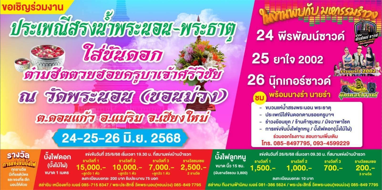 วัดพระนอน (ขอนม่วง) ต.ดอนแก้ว อ.แม่ริม จ.เชียงใหม่ ขอเชิญชวนพี่น้องประชาชนในพื้นที่ และพื้นที่ใกล้เคียง ร่วมสืบสานและอนุรักษ์วัฒนธรรมล้านนา ในงาน “ประเพณีสรงน้ำพระนอน-พระธาตุ ใส่ขันดอก ตามฮีตฮอยฮอมครูบาเจ้าศรีวิชัย” ระหว่างวันที่ 24 – 26 มิถุนายน 2568 ณ วัดพระนอน (ขอนม่วง) ต.ดอนแก้ว อ.แม่ริม จ.เชียงใหม่