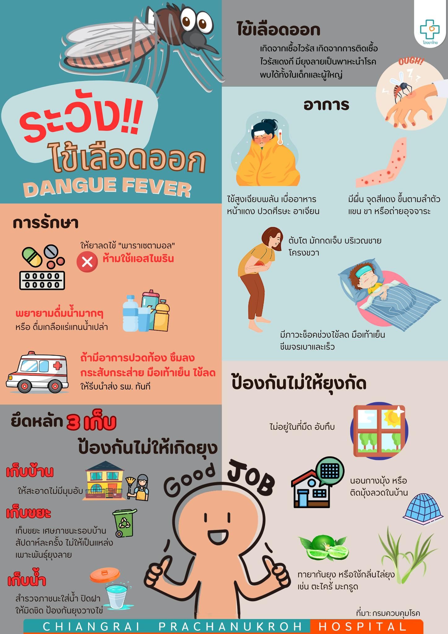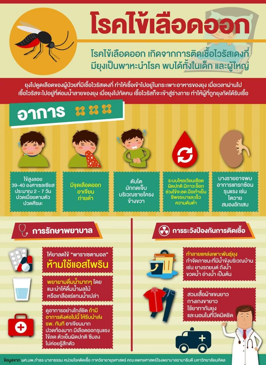 จากข้อมูลของกรมควบคุมโรค กระทรวงสาธารณสุข พบว่าในช่วงนี้ มีโอกาสพบผู้ป่วยโรคไข้เลือดออกเพิ่มขึ้น ซึ่งเป็นโรคติดต่อที่นำโดยยุงลาย เนื่องจากมีฝนตกลงมาในหลายพื้นที่ของประเทศ ทำให้มีน้ำขังตามภาชนะต่างๆ เป็นแหล่งเพาะพันธุ์ของยุงลาย ชอบวางไข่ในภาชนะต่างๆ ที่มีน้ำขัง โดยเฉพาะภาชนะใส่น้ำใช้, ภาชนะที่ไม่ใช้แล้ว, อ่างบัว, ยางรถยนต์ที่ไม่ใช้แล้ว ซึ่งภาชนะเหล่านี้ จะมีกระจัดกระจายอยู่ทั่วไปในชุมชน หรือในบ้าน เป็นปัจจัยสนับสนุนให้เกิดการระบาดของโรคได้