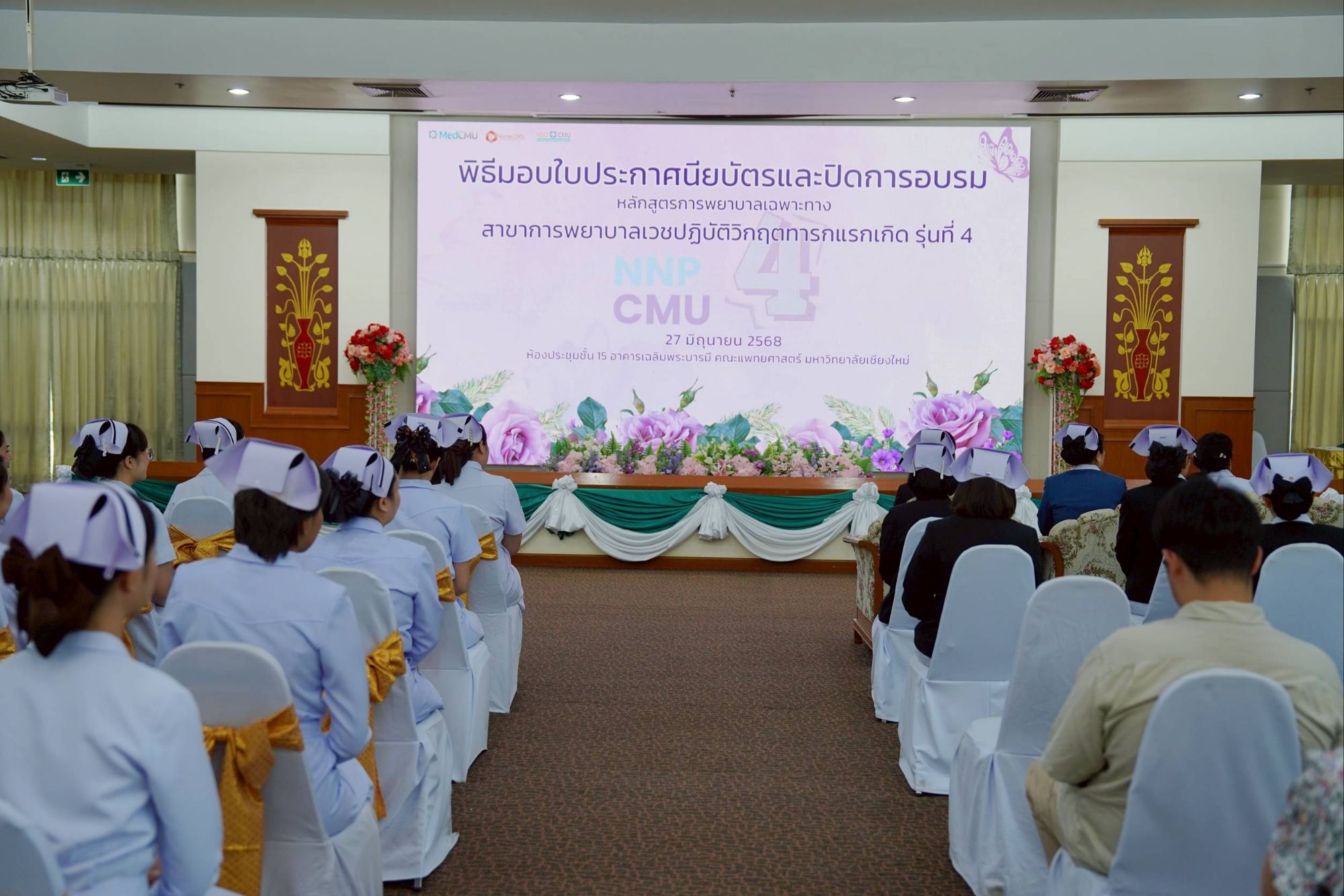 วันที่ 27 มิถุนายน 2568 ณ ห้องประชุมชั้น 15 อาคารเฉลิมพระบารมี คณะแพทยศาสตร์ มช. รศ.ดร.พญ.จิราภรณ์ โกรานา รองคณบดีด้านการฝึกอบรมแพทย์เฉพาะทาง เป็นประธานปิด และมอบใบประกาศนียบัตร การอบรมหลักสูตรการพยาบาลเฉพาะทาง สาขาการพยาบาลเวชปฏิบัติวิกฤตทารกแรกเกิด รุ่นที่ 4 ที่มีผู้เข้าร่วมการอบรมจำนวน 25 คน ด้วยระยะเวลาในการอบรมภาคทฤษฎี และฝึกปฏิบัติ 4 เดือน ตั้งแต่วันที่ 24 กุมภาพันธ์ 2568 ถึงวันที่ 27 มิถุนายน 2568