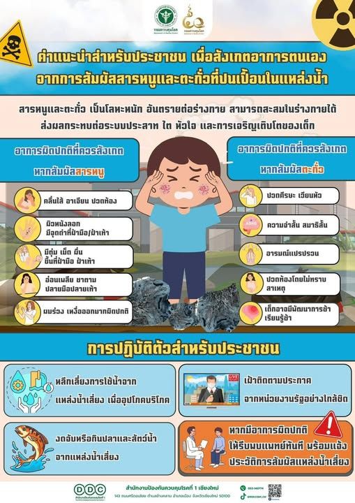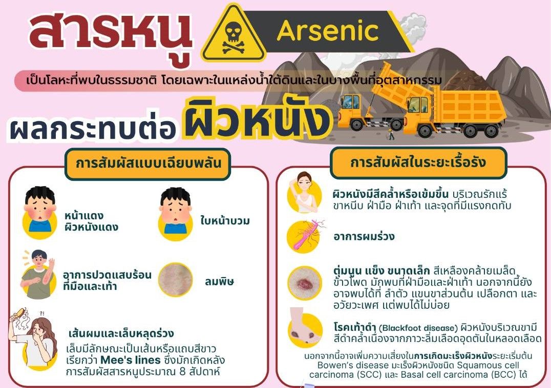 จากข้อมูลของกรมควบคุมโรค กระทรวงสาธารณสุข พบว่า สารหนู (Arsenic) เป็นโลหะที่พบได้ในธรรมชาติ โดยเฉพาะในน้ำใต้ดิน หรือพื้นที่อุตสาหกรรม เช่น เหมืองแร่ หากร่างกายได้รับสารหนูในปริมาณสูง หรือสะสมต่อเนื่องเป็นเวลานาน อาจส่งผลกระทบต่อระบบต่าง ๆ ของร่างกาย เช่น ระบบประสาท ระบบทางเดินอาหาร ระบบทางเดินหายใจ และระบบผิวหนัง หากได้รับสารหนูในระยะเฉียบพลัน อาจส่งผลต่อผิวหนัง เช่น ผิวแดง คัน บวม หรือรู้สึกแสบร้อนบริเวณมือและเท้า บางรายอาจมีอาการลมพิษ รวมถึงมีแถบสีขาวบนเล็บ (Mee’s lines) ซึ่งมักปรากฏภายหลังการสัมผัสสารหนูประมาณ 8 สัปดาห์ ซึ่งการได้รับสารหนูในระยะยาว อาจทำให้เกิดการเปลี่ยนแปลงของผิวหนัง เช่น ผิวคล้ำหรือเข้มขึ้น โดยเฉพาะบริเวณรักแร้ ขาหนีบ ฝ่ามือ และฝ่าเท้า โดยอาจมีจุดสีซีดแทรกอยู่บนผิวคล้ำ เรียกว่า “Raindrop on a dusty road” และอาจพบอาการผมร่วงร่วมด้วย หรือตุ่มนูนแข็งสีเหลืองคล้ายเมล็ดข้าวโพด (Arsenical keratoses) บริเวณฝ่ามือและฝ่าเท้า ในบางรายอาจพบความผิดปกติที่ขา หรือโรคที่เรียกว่า “เท้าดำ” ซึ่งเกี่ยวข้องกับการไหลเวียนเลือด หากมีข้อสงสัยหรือพบอาการผิดปกติที่ผิวหนัง ประชาชนสามารถเข้ารับการตรวจวินิจฉัยได้ โดยมีการตรวจระดับสารหนูในเลือด ปัสสาวะ เส้นผม หรือเล็บ โดยค่าปกติในเลือดอยู่ที่ 0–13 ไมโครกรัม/ลิตร และในปัสสาวะ 0–35 ไมโครกรัม/ลิตร หากตรวจพบเกินเกณฑ์ แพทย์อาจพิจารณาตรวจเพิ่มเติม เช่น การตรวจชิ้นเนื้อผิวหนัง