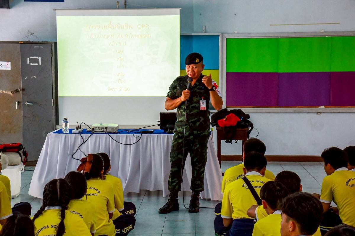เมื่อวันที่ 2 ก.ค.68 ชป.กร.มทบ.33(1) โดย พัน.มทบ.33 จัดกำลังพลเป็นวิทยากร ในกิจกรรมพัฒนาคุณธรรมจริยธรรมของนักเรียน ระดับชั้นมัธยมศึกษาปีที่ 1-6 ประจำปีงบประมาณ 2568 จำนวน 520 คน ของโรงเรียนหอพระ จังหวัดเชียงใหม่ โดยให้ความรู้ในเรื่อง ประวัติธงชาติไทย, การแสดงของ มว.สท.พัน.มทบ.33, การปฐมพยาบาลเบื้องต้น, การฝึกระเบียบวินัย ทักษะชีวิต และจิตอาสา