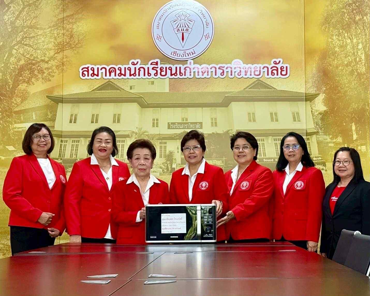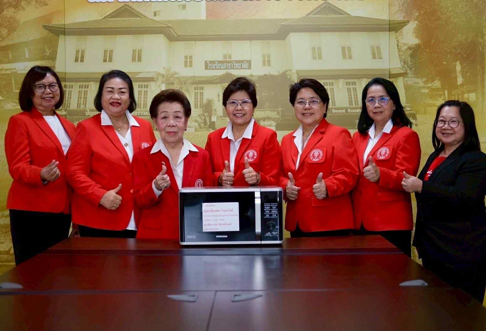 คุณปรานอม ก้านเหลือง เลขานุการ/คุณแสงทิตย์ ชัยตาน ผู้ช่วยเหรัญญิก/คุณจิรวัณย์ นันทวงศ์ ผู้ช่วยเหรัญญิก ร่วมส่งมอบ ตู้เย็น ยี่ห้อ ซัมซุง ขนาด 13.9 คิว และไมโครเวฟเพื่อใช้ในห้องประชุมสมาคมนักเรียนเก่าดาราวิทยาลัย (บริจาคโดย คุณเกล็ดเพชร ไทยสวัสดิ์ นายกสมาคมนักเรียนเก่าดาราวิทยาลัย และ คุณพัชราภรณ์ พิลาศลักษณ์ อุปนายก) พร้อมกันนี้ ได้มอบกระจกขนาดใหญ่เพื่อดูความเรียบร้อย