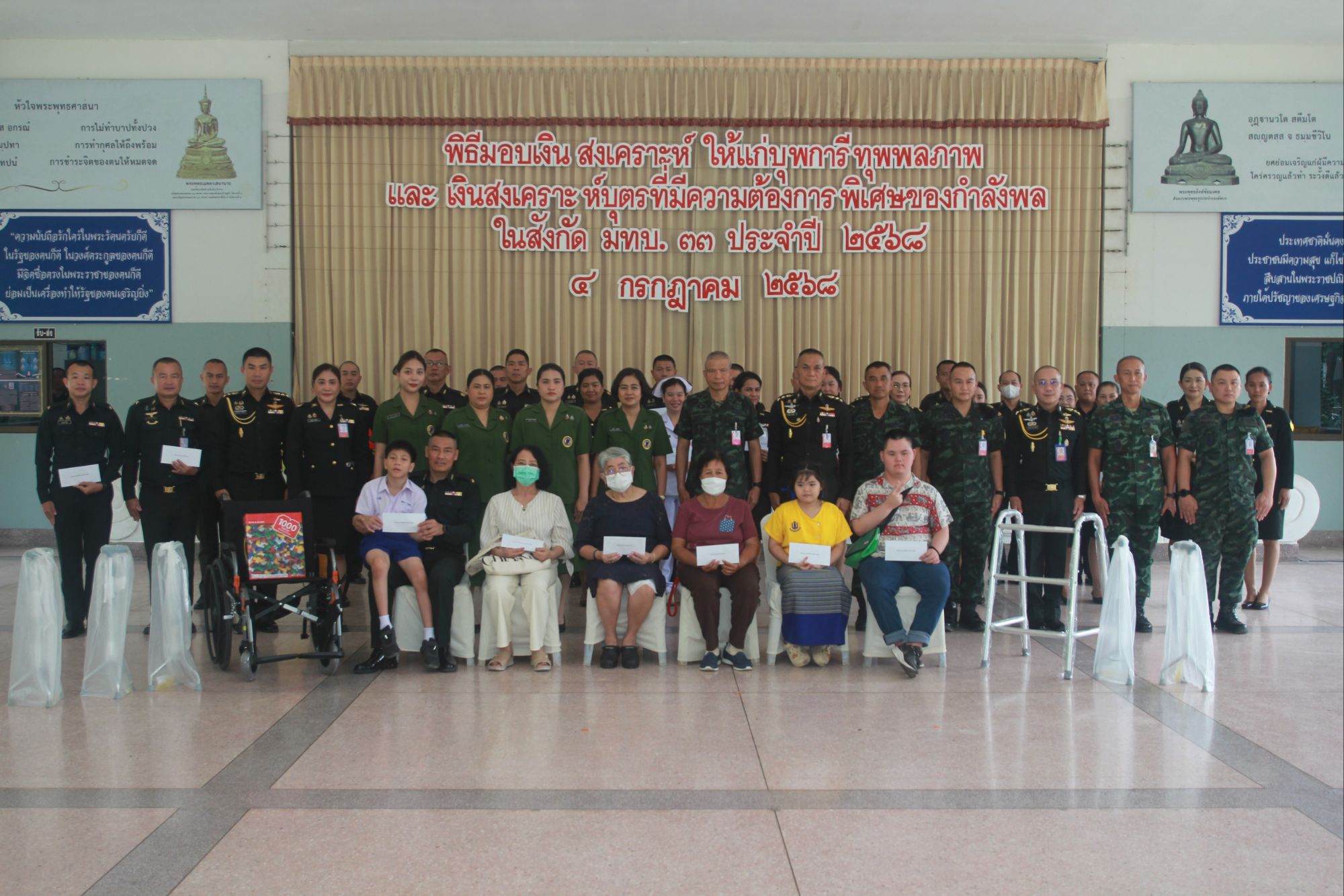เมื่อวันที่ 4 กรกฎาคม 2568 พลตรี ธีระ ผดุงสุนทร ผู้บัญชาการมณฑลทหารบกที่ 33 พร้อมด้วยคณะผู้บังคับบัญชา และ พันเอก หญิง อรอุมา อุตรพงศ์ รองประธานสมาคมแม่บ้านทหารบก สาขา มณฑลทหารบกที่ 33 พร้อมคณะฯ ร่วมพิธีมอบเงินสงเคราะห์ ให้เเก่บุพพาการีทุพพลภาพ เเละบุตรที่มีความต้องการพิเศษของกำลังพล มณฑลทหารบกที่ 33 ประจำปี 2568 พร้อมทั้งมอบกายอุปกรณ์ ประเภท รถเข็นนั่ง, ไม้ค้ำช่วยเดิน, ของเล่นเสริมพัฒนาการ ณ ศาสนสถานค่ายกาวิละ อำเภอเมือง จังหวัดเชียงใหม่