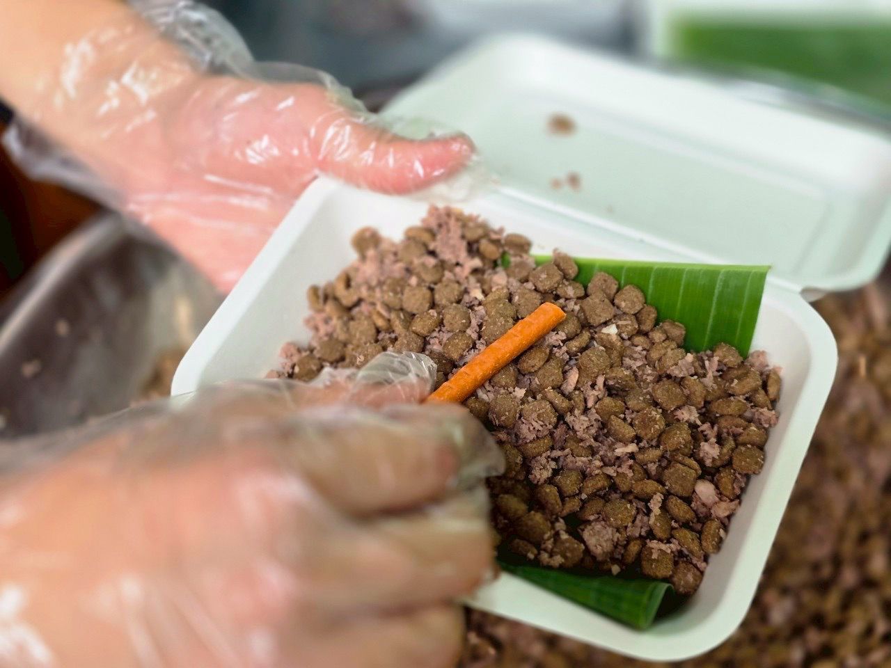 สำหรับกิจกรรมในวันพระใหญ่นี้ ได้จัดเตรียมอาหารสุนัขในรูปแบบข้าวกล่องซึ่งประกอบด้วยอาหารเม็ดคุณภาพ ผสมกับเนื้อสัตว์ ตับ และขนมขบเคี้ยวเพื่อเสริมสุขภาพของสัตว์ พร้อมทั้งใช้บรรจุภัณฑ์จากวัสดุย่อยสลายได้ วางบนใบตองอย่างเรียบร้อย เพื่อแสดงถึงความใส่ใจในสิ่งแวดล้อมควบคู่กับความเมตตาต่อสัตว์