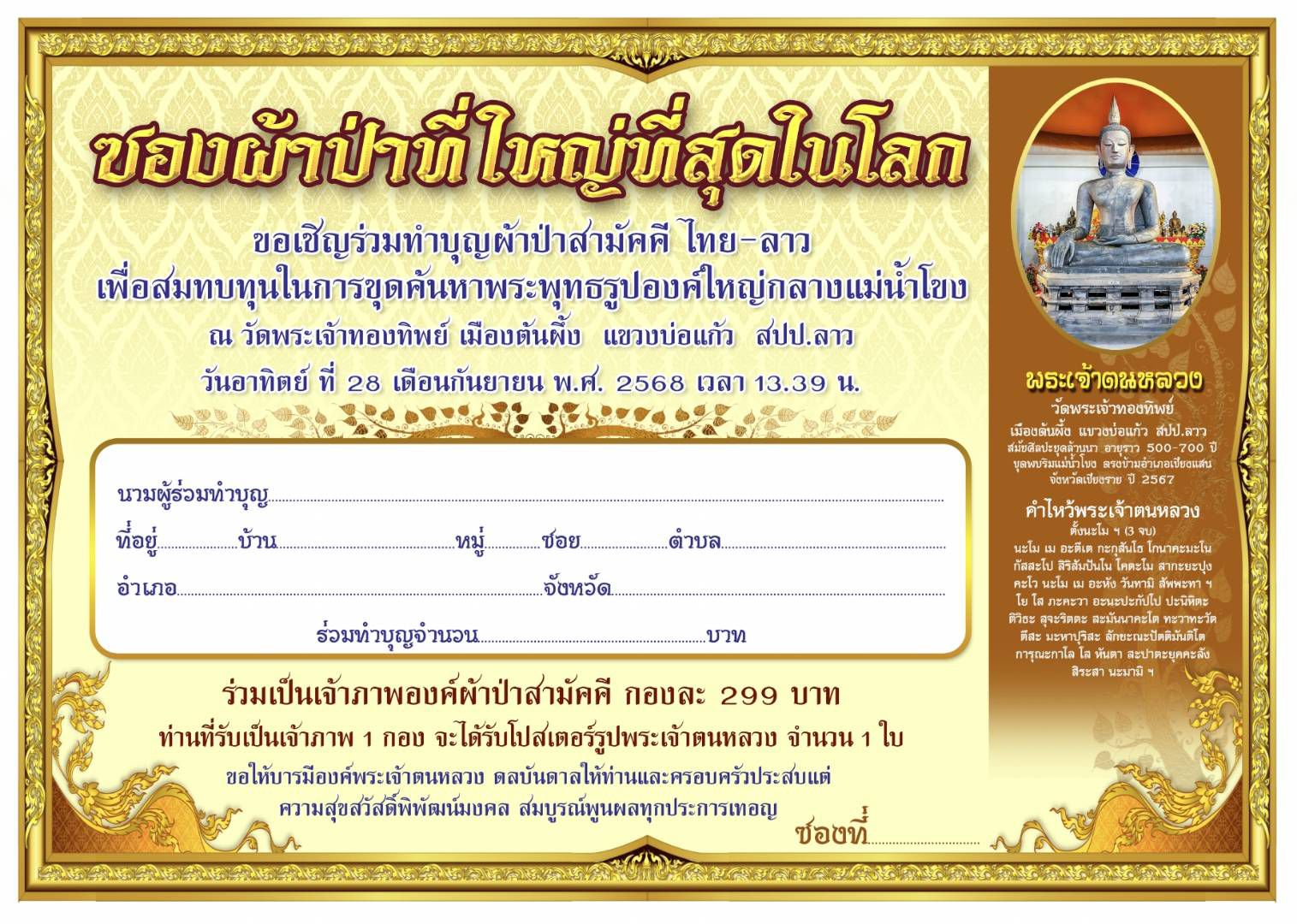 ที่จังหวัดลำพูน บ้านโภคทรัพย์ บารมีธรรมลำพูน ได้จัดทำซองผ้าป่าสามัคคีขนาดใหญ่ที่สุดในโลก ขนาด 13 คูณ 18 นิ้ว ภายในบรรจุภาพพระเจ้าตนหลวง ขนาด 12 คูณ 17.5 นิ้ว จัดทำเพียง 900 ซอง เท่านั้น แต่ละซองมีหมายเลขกำกับทุกซอง ร่วมทำบุญกองละ 299 บาท ต่อกองต่อซอง เพื่อเชิญชวนพุทธศาสนิกชนร่วมเป็นเจ้าภาพทอดผ้าป่าสามัคคี ไทย-ลาว ตามรอยครูบาเจ้าศรีวิชัย นักบุญแห่งล้านนา ณ วัดพระเจ้าทองทิพย์ เมืองต้นผึ้ง แขวงบ่อแก้ว สปป.ลาว ในวันอาทิตย์ที่ 28 กันยายน 2568