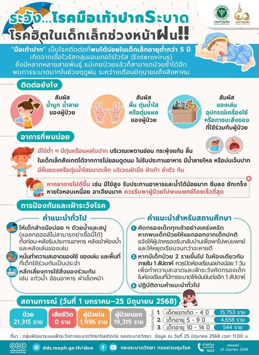 สำหรับสถานการณ์โรคมือเท้าปาก ณ วันที่ 1 กรกฎาคม 2568 มีรายงานผู้ป่วยสะสม 24,008 ราย กลุ่มอายุที่พบมากที่สุด คือ เด็กแรกเกิดถึง 4 ปี จำนวน 17,739 ราย ซึ่งมีมากกว่าร้อยละ 70 ของผู้ป่วยทั้งหมด รองลงมา คือ กลุ่มเด็กอายุ 5 – 9 ปี (ร้อยละ 22.0) และกลุ่มอายุ 10 – 14 ปี (ร้อยละ 2.5) ตามลำดับ
