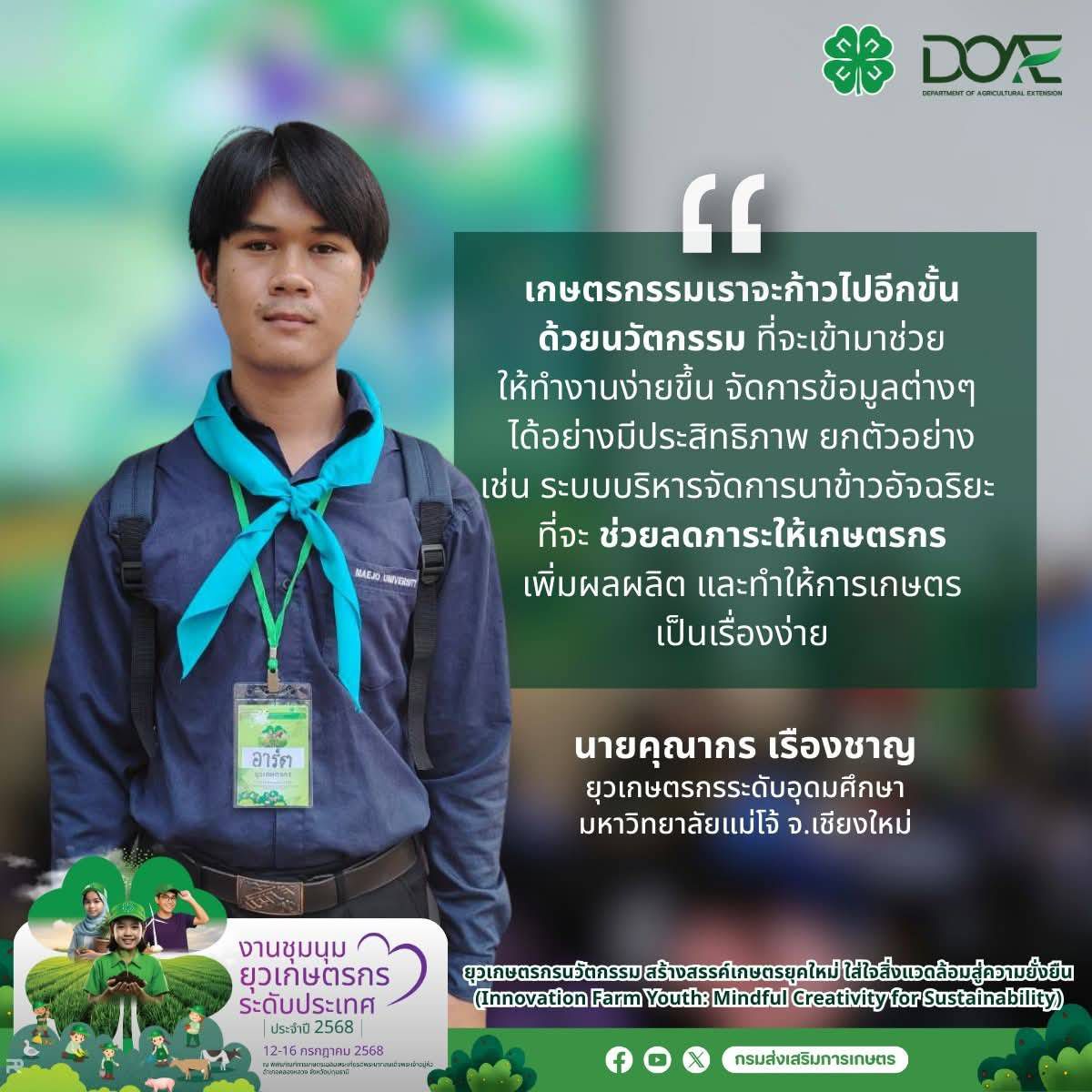 ซึ่งจัดโดย กรมส่งเสริมการเกษตร ภายใต้แนวคิด “ยุวเกษตรกรนวัตกรรม : สร้างสรรค์เกษตรยุคใหม่ ใส่ใจสิ่งแวดล้อม สู่ความยั่งยืน” ระหว่างวันที่ 12–16 กรกฎาคม 2568 เพื่อเปิดเวทีแลกเปลี่ยนเรียนรู้ เสริมสร้างแรงบันดาลใจ และพัฒนาเครือข่ายยุวเกษตรกรทั่วประเทศให้เข้มแข็งและยั่งยืน