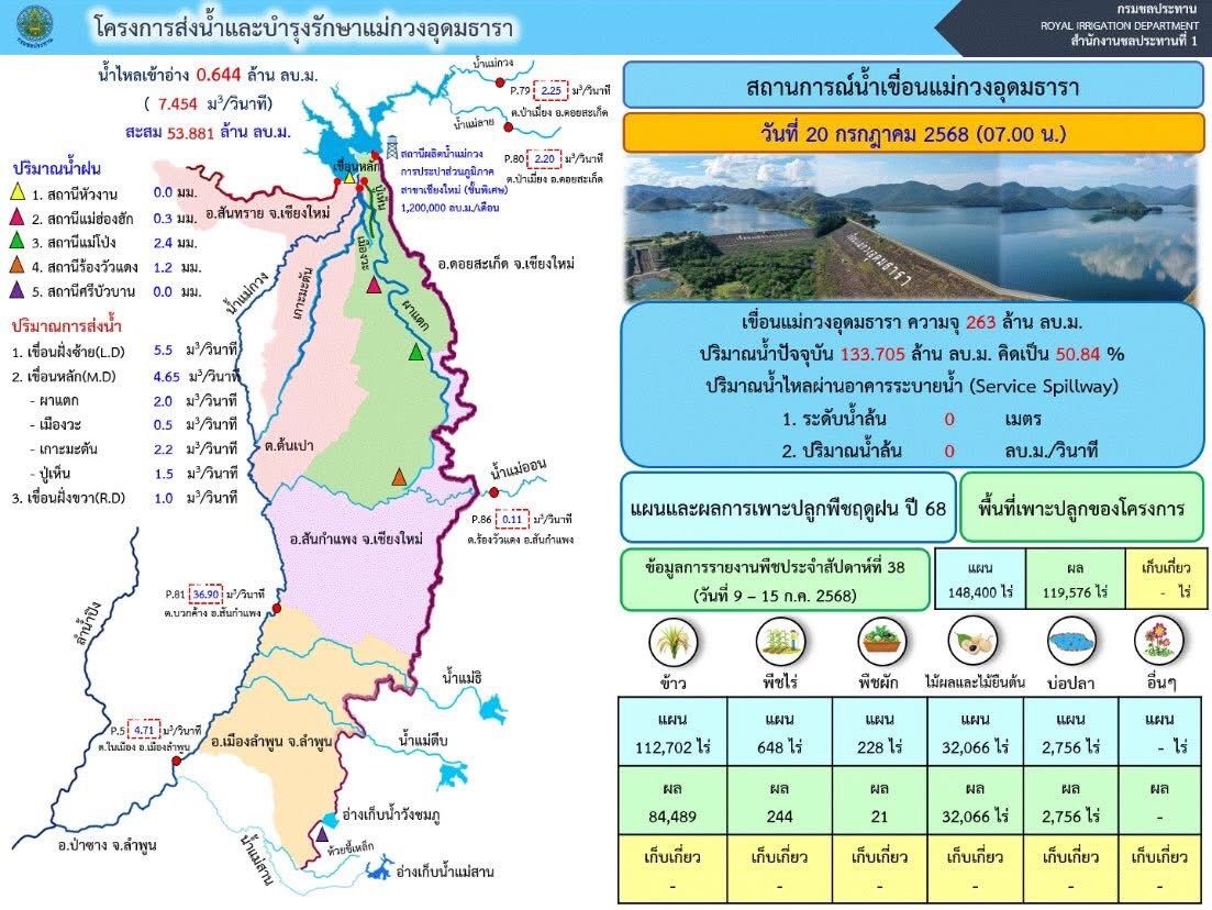 “คาดการณ์อิทธิพลจากพายุวิภา 5 วัน (วันที่ 20-24 ก.ค.) คาดจะมีน้ำไหลลงอ่างวันละประมาณ 2 ล้าน ลบ.ม. โดยรวมแล้วคาดจะมีน้ำเข้าเขื่อนแม่กวงฯ 10 ล้าน ลบ.ม ซึ่งจะส่งผลให้น้ำในอ่างเก็บน้ำเขื่อนแม่กวงฯ ณ วันที่ 25 ก.ค. จะมีอยู่ราว 144 ล้าน ลบ.ม. (หรือ 55% ของความจุ) ซึ่งยังเป็นไปตามเกณฑ์การบริหารจัดการน้ำในช่วงเวลาที่กำหนด ทั้งนี้ในช่วงเดือนกรกฎาคม เขื่อนแม่กวงอุดมธารายังสามารถรับน้ำได้ประมาณ 59 ล้าน ลบ.ม. ส่วนการส่งน้ำเพื่อการเกษตร โครงการฯ ได้ส่งน้ำให้พื้นที่เกษตรดังนี้ ส่งจากเขื่อนฝั่งซ้าย 5.5 ลบ.ม./วินาที เขื่อนฝั่งขวา 1.0 ลบ.ม./วินาที และส่งจากเขื่อนหลัก 4.0 ลบ.ม./วินาที รวมส่งน้ำให้พื้นที่เกษตร 10.5 ลบ.ม./วินาที หรือในปริมาณ 907,200 ลบ.ม ต่อวัน อย่างไรก็ตาม โครงการส่งน้ำและบำรุงรักษาแม่กวงอุดมธาราได้ดำเนินการประชาสัมพันธ์ตามประกาศของกรมอุตุนิยมวิทยา และหนังสือจังหวัดเชียงใหม่ พร้อมยังร่วมมือกับองค์การบริหารส่วนจังหวัดเชียงใหม่ในการขุดลอกและกำจัดวัชพืชเพื่อรองรับการระบายน้ำในพื้นที่” นายเฉลิมเกียรติฯ กล่าว.