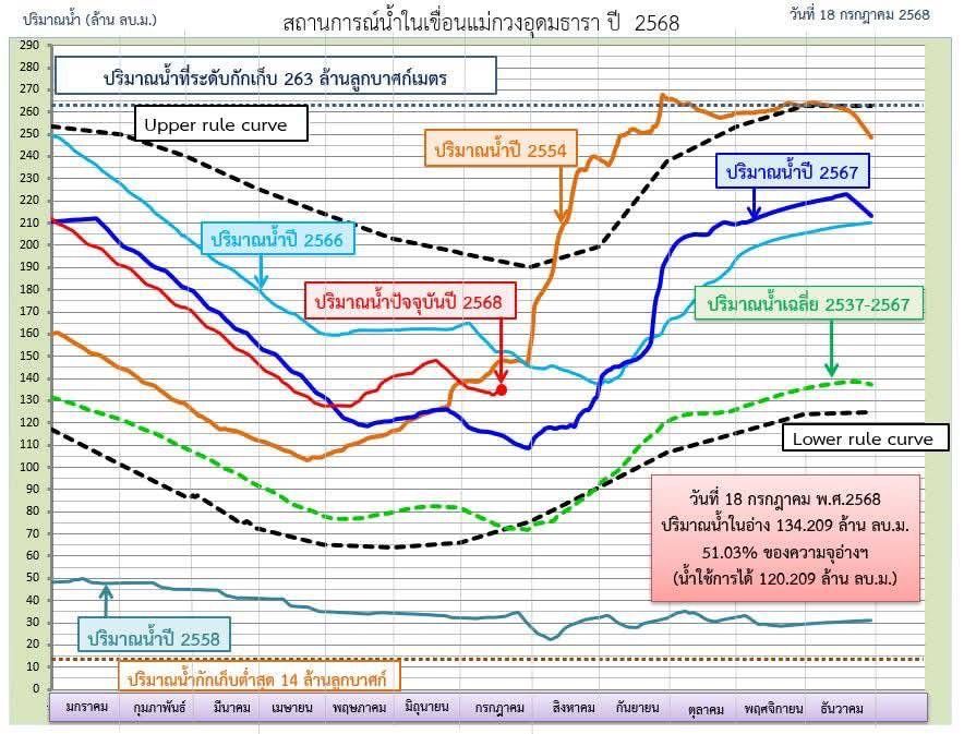 สำหรับสถานกการณ์น้ำในอ่างเก็บน้ำเขื่อนแม่กวงอุดมธารา นายเฉลิมเกียรติ อินทกนก ผคบ.แม่กวงฯ เปิดเผยว่า ปริมาณน้ำในเขื่อนแม่กวงฯ ยังอยู่ในเกณฑ์การบริหารจัดการน้ำในช่วงเวลาที่กำหนด (ช่วงเดือน ก.ค.) โดยให้มีปริมาณน้ำในอ่างไม่เกิน 193 ล้าน ลบ.ม. (ณ ปัจจุบัน ตาม URC) และ ณ วันที่ 1 พ.ย. ซึ่งสิ้นสุดฤดูฝนต้องไม่เกิน 250 ล้าน ลบ.ม.(95% ของความจุอ่างที่ 263 ล้าน ลบ.ม.) ขณะนี้ปริมาณน้ำในเขื่อนแม่กวงฯ มีปริมาณน้ำกักเก็บอยู่ที่ 133.705 ล้าน ลบ.ม. คิดเป็น 50.84% ของความจุ