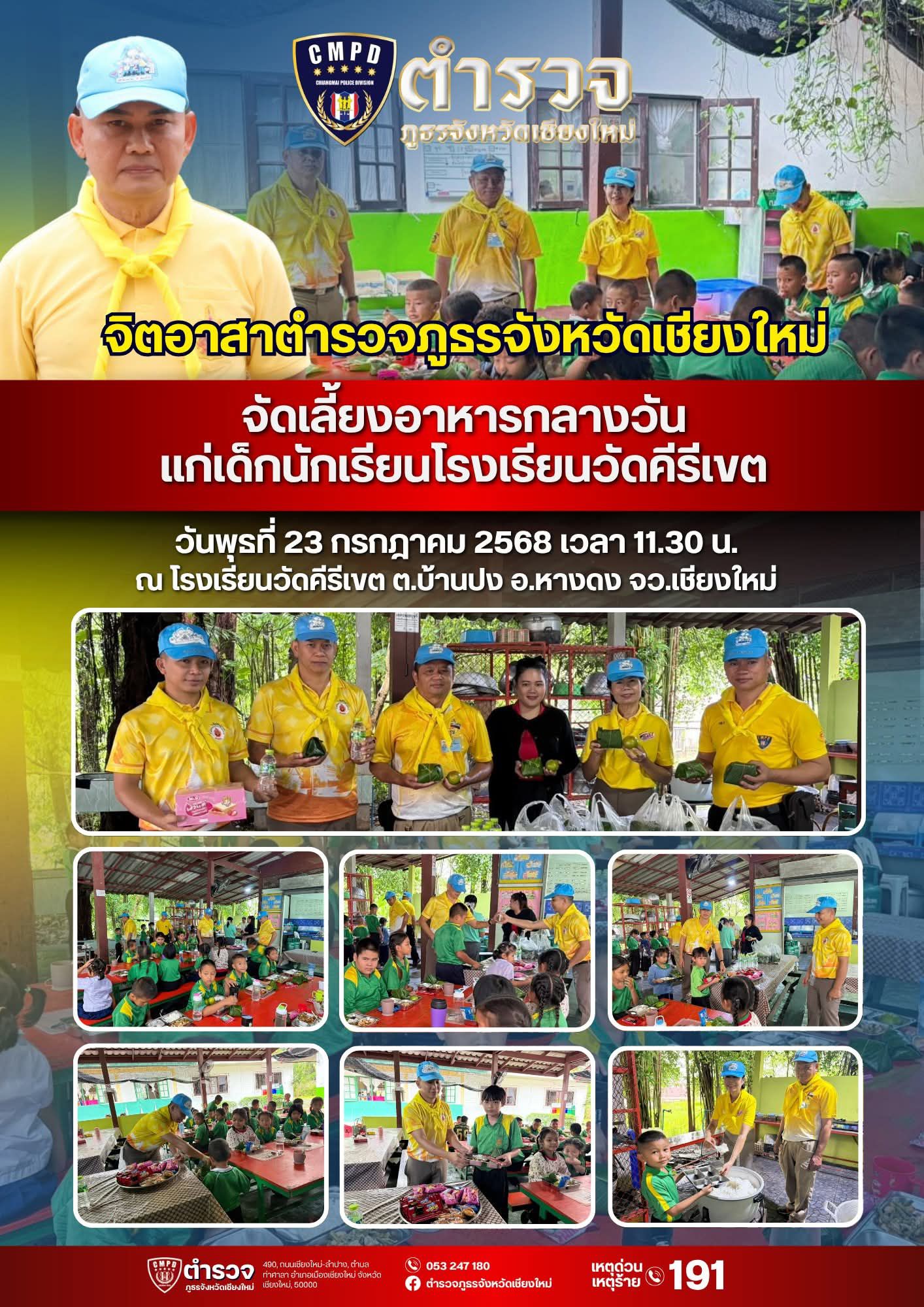 จิตอาสาตำรวจภูธรจังหวัดเชียงใหม่ จัดกิจกรรมจิตอาสาเลี้ยงอาหารกลางวันให้กับนักเรียน โรงเรียนวัดคีรีเขต อ.หางดง จ.เชียงใหม่