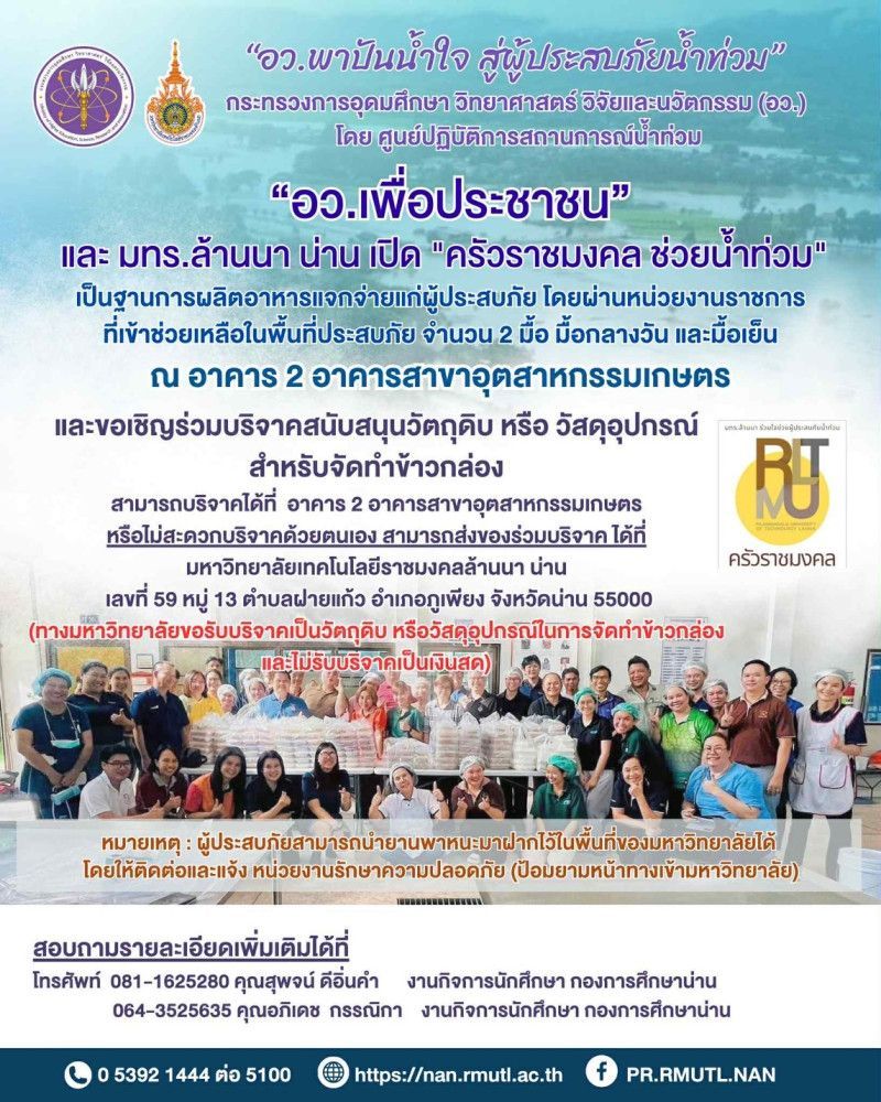 ศูนย์มทร.ล้านนา น่าน ผศ.ดร.วิโรจน์ มงคลเทพ ผู้อำนวยการสำนักบริหาร มทร.ล้านนา น่าน ได้เปิดดำเนินการ “ครัวราชมงคล ช่วยน้ำท่วม” ณ อาคาร 2 สาขาอุตสาหกรรมเกษตร โดยจัดเป็นฐานการผลิตอาหารปรุงสุก เพื่อแจกจ่ายแก่ผู้ประสบภัยผ่านความร่วมมือกับหน่วยงานภาครัฐและเจ้าหน้าที่ในพื้นที่ โดยจัดเตรียมอาหารวันละ 2 มื้อ ได้แก่ มื้อกลางวันและมื้อเย็นและเปิดรับบริจาควัตถุดิบ หรือ วัสดุอุปกรณ์ สำหรับจัดทำข้าวกล่อง สามารถบริจาคได้ที่ อาคาร 2 อาคารสาขาอุตสาหกรรมเกษตร พร้อมกันนี้ยังเปิดพื้นที่ภายในมหาวิทยาลัยสำหรับให้บริการจอดรถแก่หน่วยงานที่เข้าช่วยเหลือและประชาชนที่ได้รับผลกระทบอีกด้วย