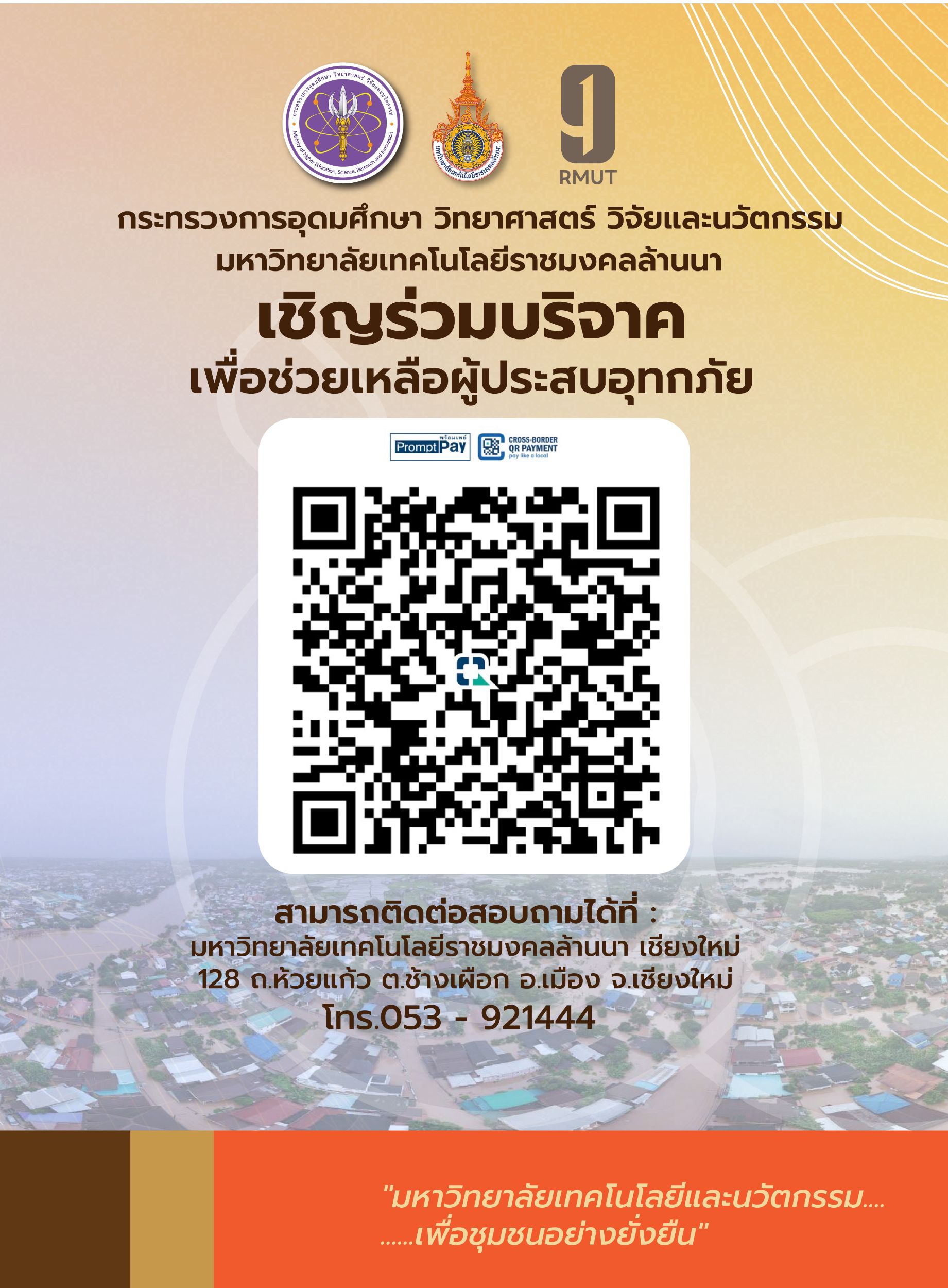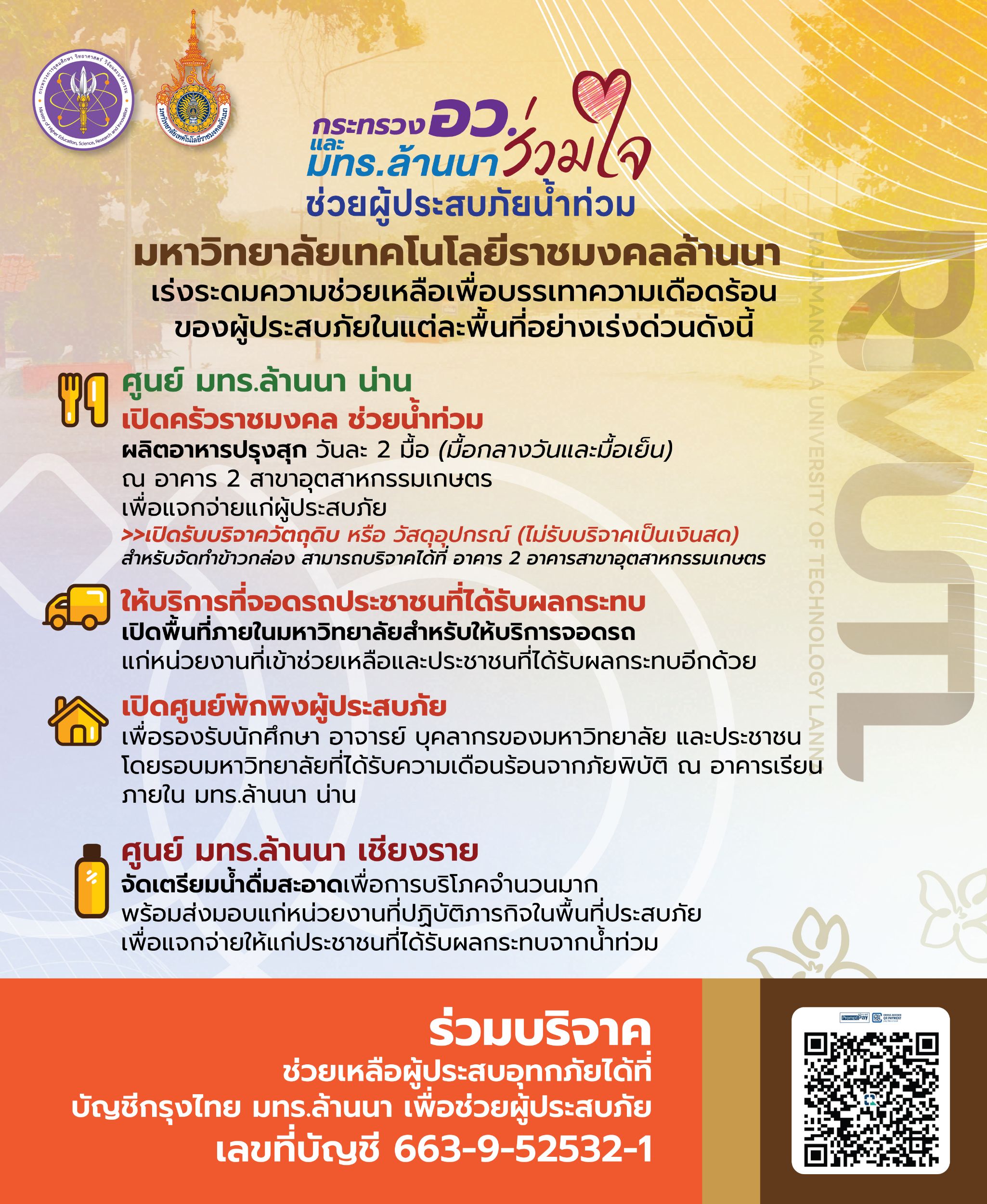 โดยสามารถร่วม บริจาคเพื่อร่วมบริจาคช่วยเหลือผู้ประสบอุทกภัยได้ที่บัญชี มทร.ล้านนา เพื่อช่วยผู้ประสบภัย ธนาคารกรุงไทย เลขที่บัญชี 663-9-52532-1 มหาวิทยาลัยเทคโนโลยีราชมงคลล้านนา ขอยืนยันเจตนารมณ์ในการเป็นส่วนหนึ่งของสังคมที่พร้อมช่วยเหลือประชาชนในยามวิกฤต พร้อมขอส่งกำลังใจแก่ผู้ประสบภัยทุกท่านให้ผ่านพ้นช่วงเวลาอันยากลำบากนี้ไปได้โดยเร็ว.