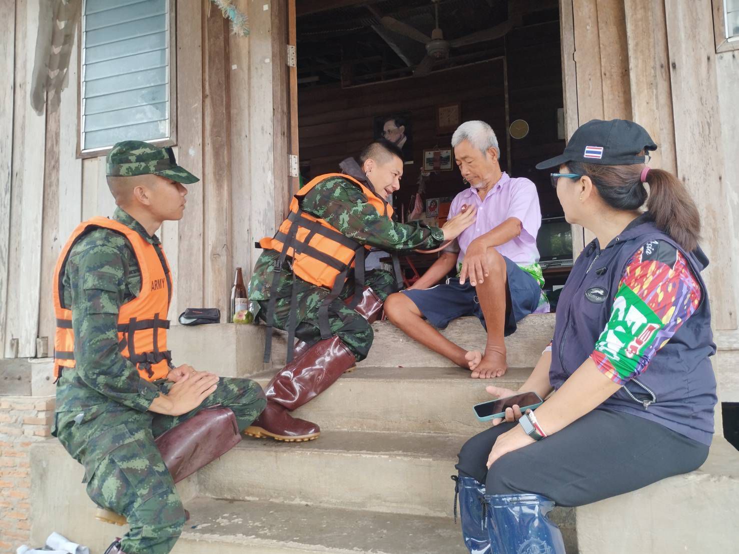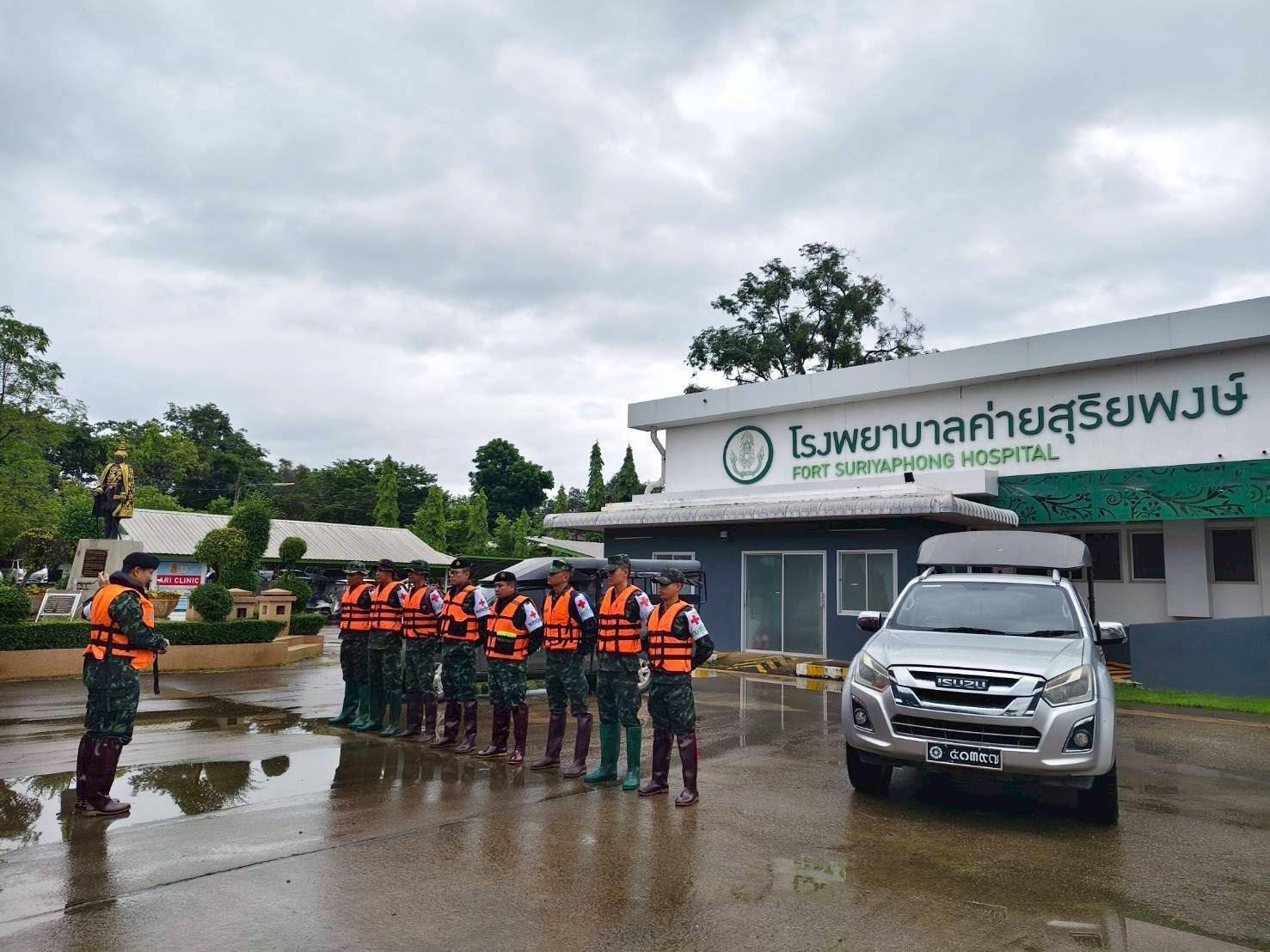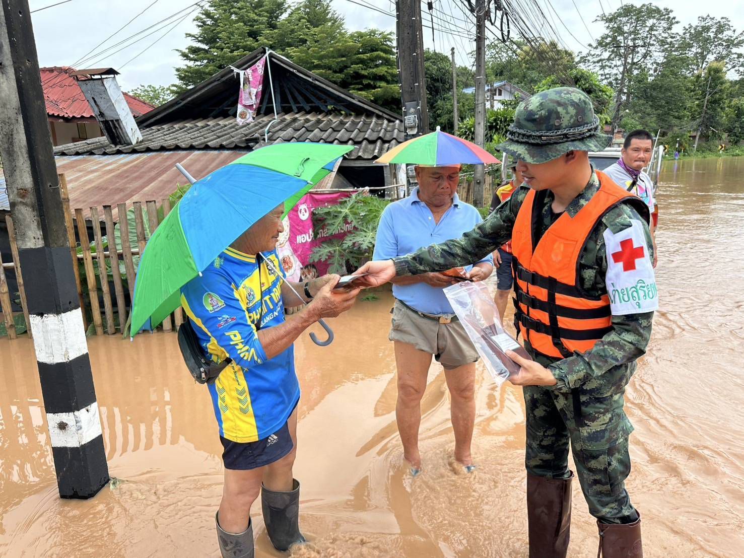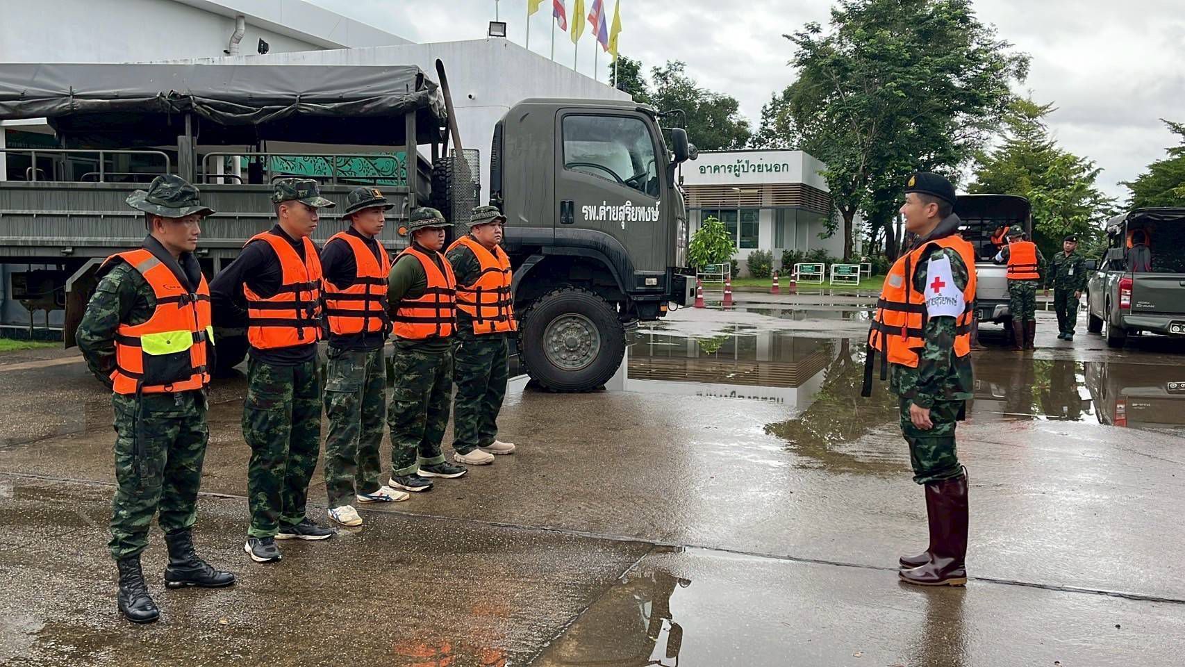 เมื่อวันที่ 24 กรกฎาคม 2568 พลตรี บุญญฤทธิ์ เกษตรเวทิน ผู้บัญชาการศูนย์บรรเทาสาธารณภัยมณฑลทหารบกที่ 38 จัดกำลังพลชุดแพทย์เดินเท้าช่วยเหลือพื้นที่ประสบอุทกภัย จาก โรงพยาบาลค่ายสุริยพงษ์ จำนวน 2 ชุด ประกอบด้วยแพทย์ นายสิบพยาบาล และพลทหารเสนารักษ์ ลงพื้นที่ให้ความช่วยเหลือประชาชนที่ได้รับผลกระทบจากอุทกภัยในพื้นที่หมู่บ้านน้ำต้วน และบ้านบุปผาราม อำเภอภูเพียง จังหวัดน่าน โดยชุดแพทย์ได้เดินเท้าลุยน้ำเข้าชุมชนที่ได้รับผลกระทบอย่างหนัก สำรวจบ้านผู้สูงอายุและผู้ป่วยติดเตียง พร้อมให้บริการตรวจวัดสัญญาณชีพเบื้องต้น สอบถามอาการเจ็บป่วย และแจกจ่ายยารักษาโรคเบื้องต้นให้แก่ผู้ที่มีอาการปวดเมื่อยกล้ามเนื้อ ผื่นคันจากน้ำสกปรก รวมถึงให้คำแนะนำในการดูแลสุขภาพตนเอง เพื่อป้องกันโรคที่มากับน้ำท่วม เช่น โรคผิวหนัง น้ำกัดเท้า และโรคติดต่อในระบบทางเดินอาหาร