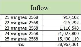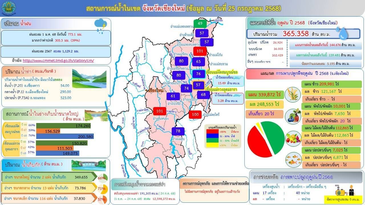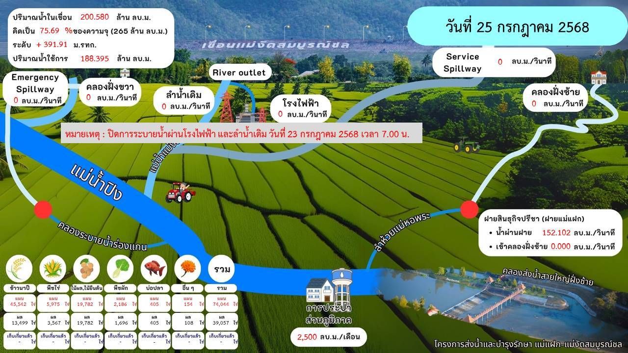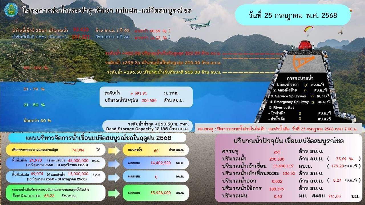 นายอัธยา อรรณพเพ็ชร ผู้อำนวยการเขื่อนแม่งัดสมบูรณ์ชล อำเภอแม่แตง จังหวัดเชียงใหม่เพยงว่าตั้งแต่การเข้ามาของพายุวิภา ผ่านมา 5 วัน วันที่ 21-25 กรกฎาคม2568 มีน้ำไหลเข้าเขื่อนแม่งัดฯ รวมจำนวน 38,967,361 ล้านลูกบาศก์เมตรลูกบาศก์เมตร พบว่าวันที่ 24กรกฎาคม 2568 มีน้ำไหลเข้าเขื่อนแม่งัดมากที่สุด จำนวน 21,027,800 ล้านลูกบาศก์เมตรลูกบาศก์เมตร ล่าสุดวันนี้ 25 กรกฎาคม 2568 มีน้ำไหลเช้าอ่าง 15,490,119 ล้านลูกบาศก์เมตรลูกบาศก์เมตร มีปริมาณน้ำ 200 ล้านลูกบาศก์เมตรลูกบาศก์เมตร คิดเป็น 75.69% เนื่องจากยังมีน้ำทะยอยไหลเข้าขื่อนแม่งัดสมบูรณ์ชลอย่างต่อเนื่อง