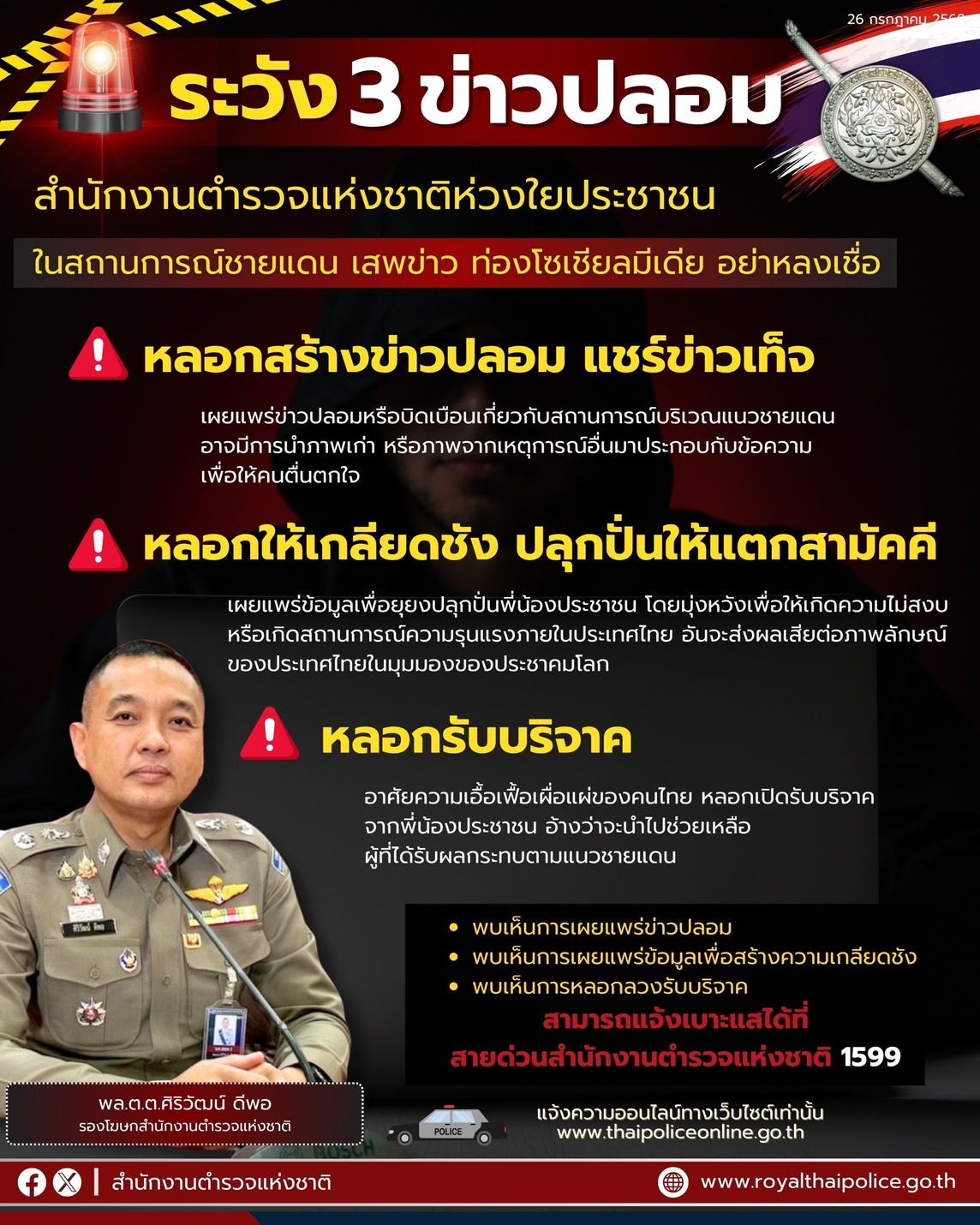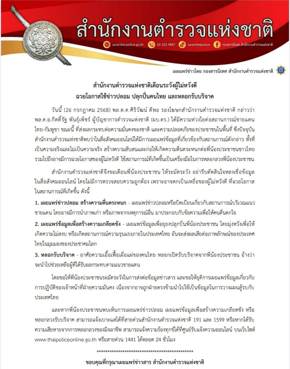 เมื่อวันที่ 26 กรกฎาคม 2568 พล.ต.ต.ศิริวัฒน์ ดีพอ รองโฆษกสำนักงานตำรวจแห่งชาติ กล่าวว่า พล.ต.อ.กิตติ์รัฐ พันธ์ุเพ็ชร์ ผู้บัญชาการตำรวจแห่งชาติ (ผบ.ตร.) ได้มีความห่วงใยต่อสถานการณ์ชายแดนไทย – กัมพูชา ขณะนี้ ที่ส่งผลกระทบต่อความมั่นคงของชาติ และความปลอดภัยของประชาชนในพื้นที่ ซึ่งปัจจุบันสำนักงานตำรวจแห่งชาติพบว่าในสื่อสังคมออนไลน์ได้มีการเผยแพร่ข้อมูลที่เกี่ยวข้องกับสถานการณ์ดังกล่าว ทั้งที่เป็นความจริงและไม่เป็นความจริง สร้างความสับสนและก่อให้เกิดความตื่นตระหนกต่อพี่น้องประชาชนชาวไทย รวมไปถึงอาจมีการฉวยโอกาสของผู้ไม่หวังดี ใช้สถานการณ์ที่เกิดขึ้นเป็นเครื่องมือในการหลอกลวงพี่น้องประชาชน
