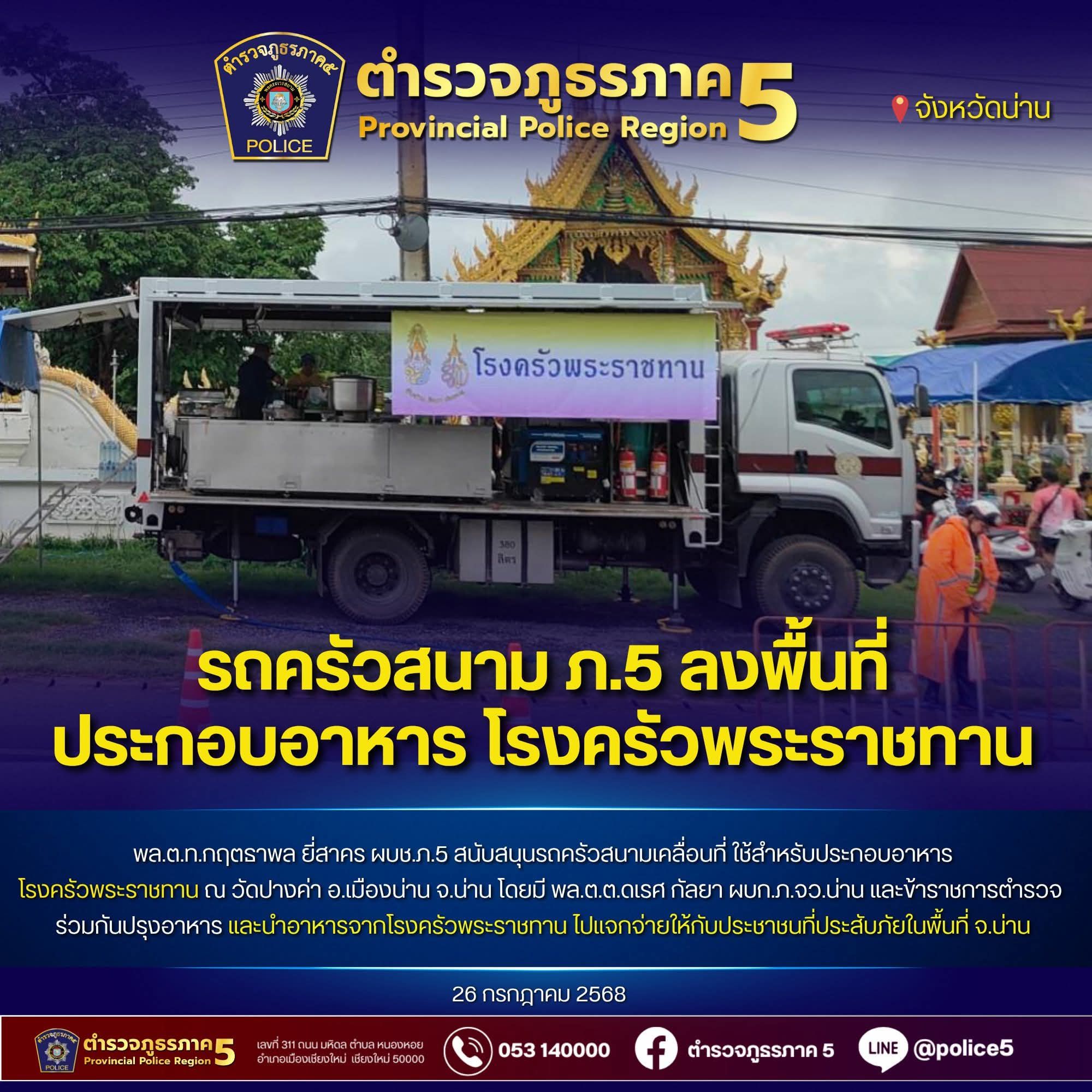 ภายใต้การสนับสนุนของ พล.ต.ท.กฤตธาพล ยี่สาคร ผู้บัญชาการตำรวจภูธรภาค 5 รถครัวสนามได้ถูกนำมาใช้สำหรับประกอบอาหารสดใหม่ โดยมี พล.ต.ต.ดเรศ กัลยา ผู้บังคับการตำรวจภูธรจังหวัดน่าน พร้อมด้วยข้าราชการตำรวจจิตอาสา ร่วมกันปรุงอาหารอย่างขะมักเขม้นภายในโรงครัวพระราชทาน จากนั้นจึงนำอาหารที่ปรุงเสร็จไปแจกจ่ายแก่พี่น้องประชาชนผู้ประสบภัยในพื้นที่ต่าง ๆ อย่างต่อเนื่อง