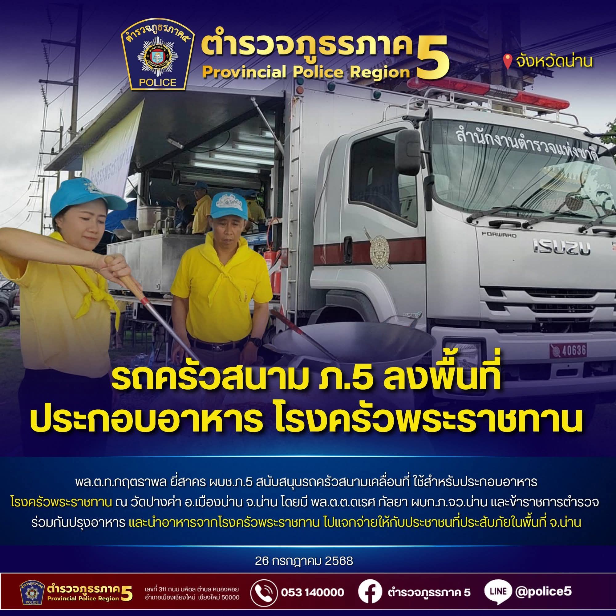 ภายใต้การสนับสนุนของ พล.ต.ท.กฤตธาพล ยี่สาคร ผู้บัญชาการตำรวจภูธรภาค 5 รถครัวสนามได้ถูกนำมาใช้สำหรับประกอบอาหารสดใหม่ โดยมี พล.ต.ต.ดเรศ กัลยา ผู้บังคับการตำรวจภูธรจังหวัดน่าน พร้อมด้วยข้าราชการตำรวจจิตอาสา ร่วมกันปรุงอาหารอย่างขะมักเขม้นภายในโรงครัวพระราชทาน จากนั้นจึงนำอาหารที่ปรุงเสร็จไปแจกจ่ายแก่พี่น้องประชาชนผู้ประสบภัยในพื้นที่ต่าง ๆ อย่างต่อเนื่อง