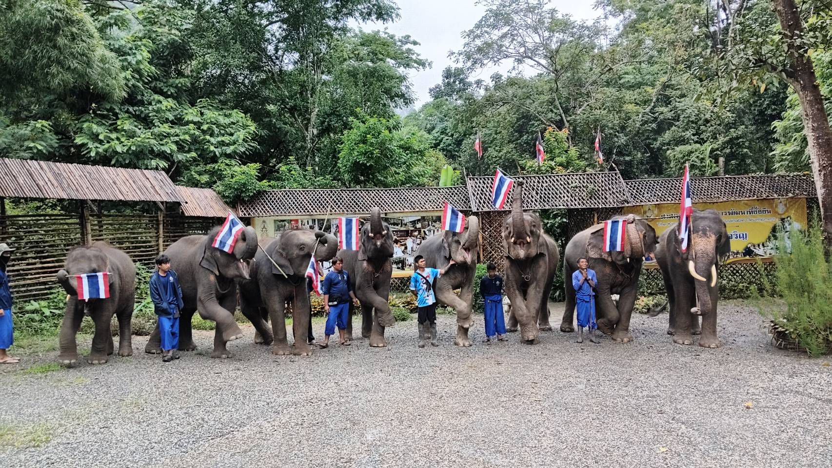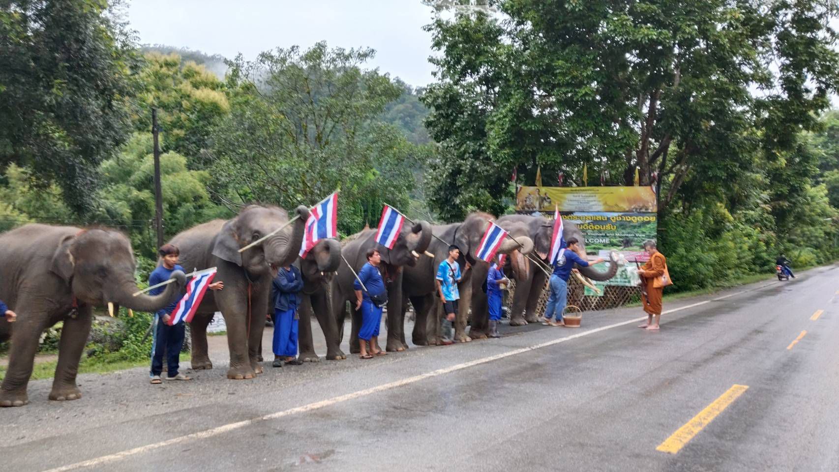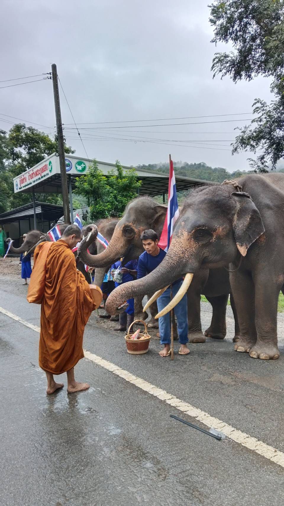 ช้างหลายเชือกร่วมพิธีตักบาตร “หัวใจรักชาติ” ส่งกำลังใจให้ทหารชายแดน ณ บ้านช้างตระกูลแสน อ.แม่แตง จ.เชียงใหม่