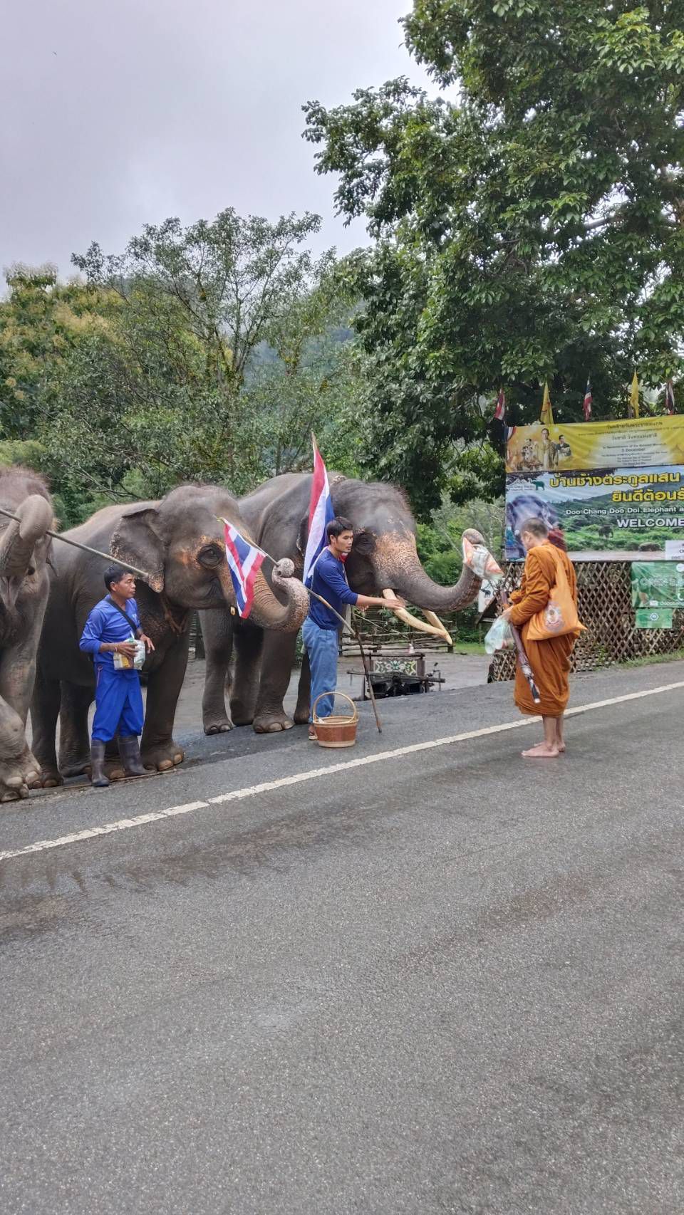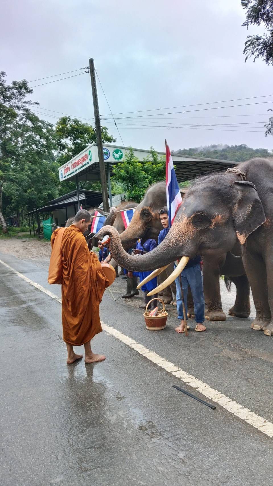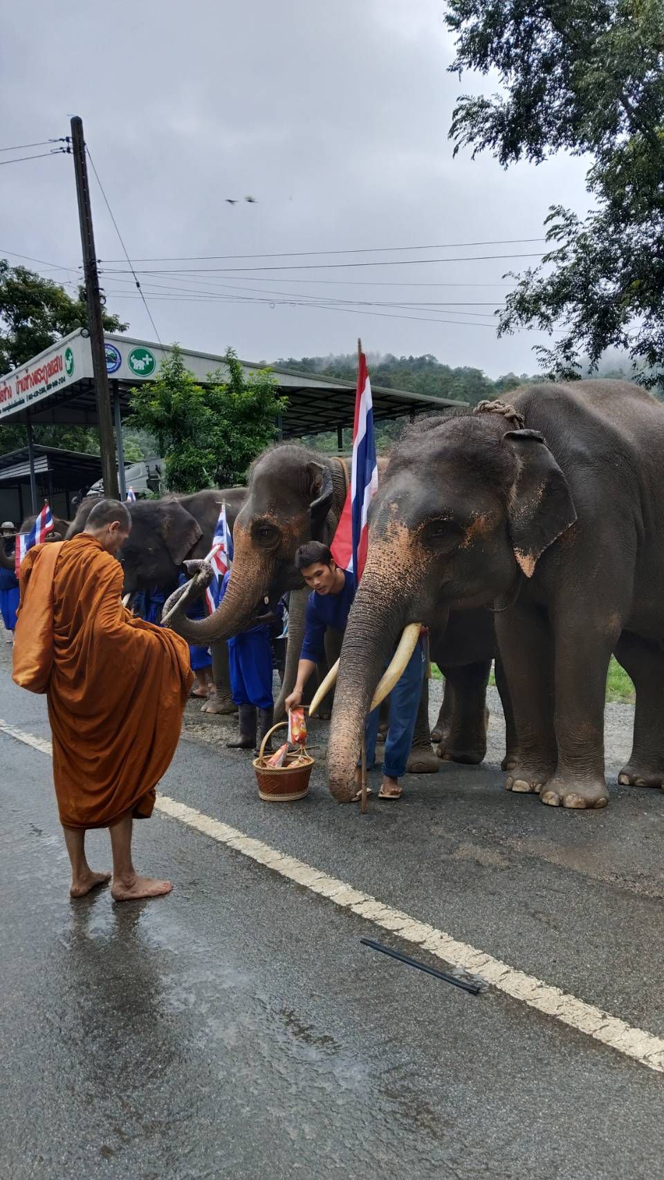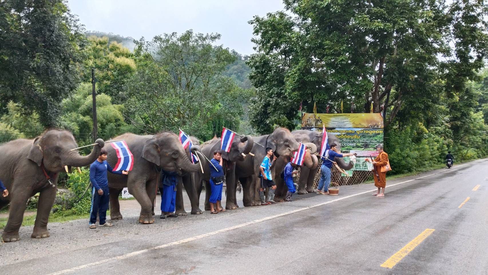 ช้างหลายเชือกร่วมพิธีตักบาตร “หัวใจรักชาติ” ส่งกำลังใจให้ทหารชายแดน ณ บ้านช้างตระกูลแสน อ.แม่แตง จ.เชียงใหม่
