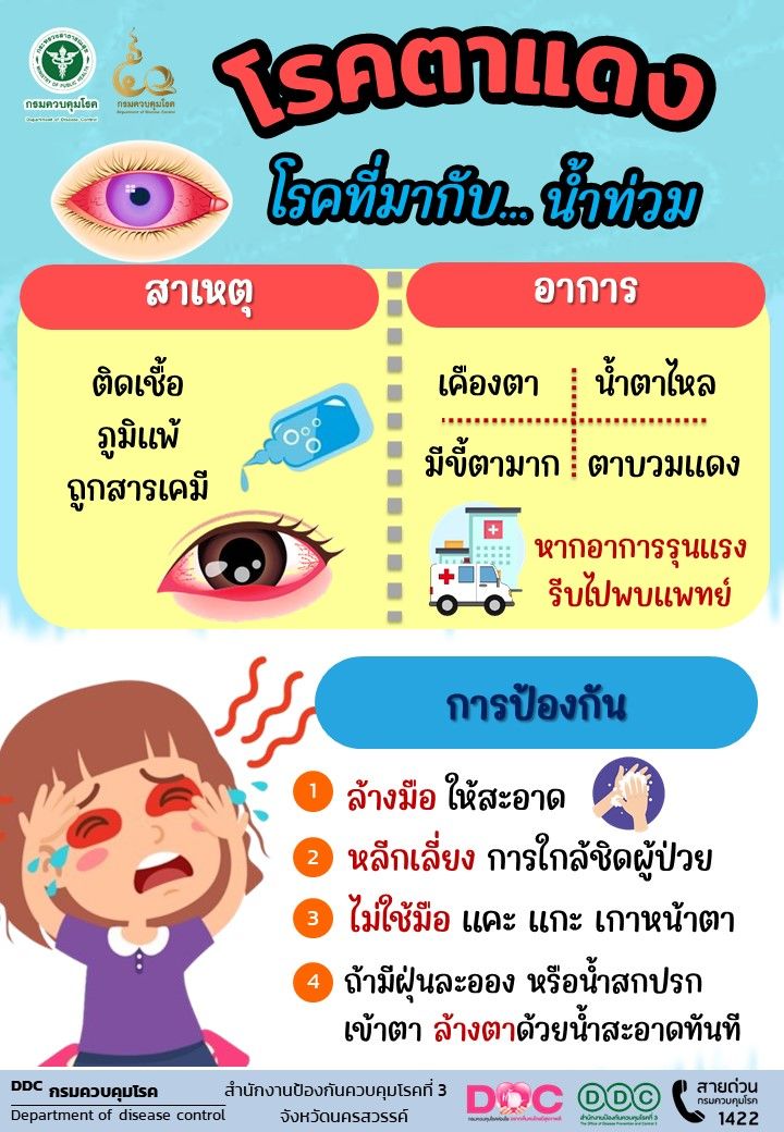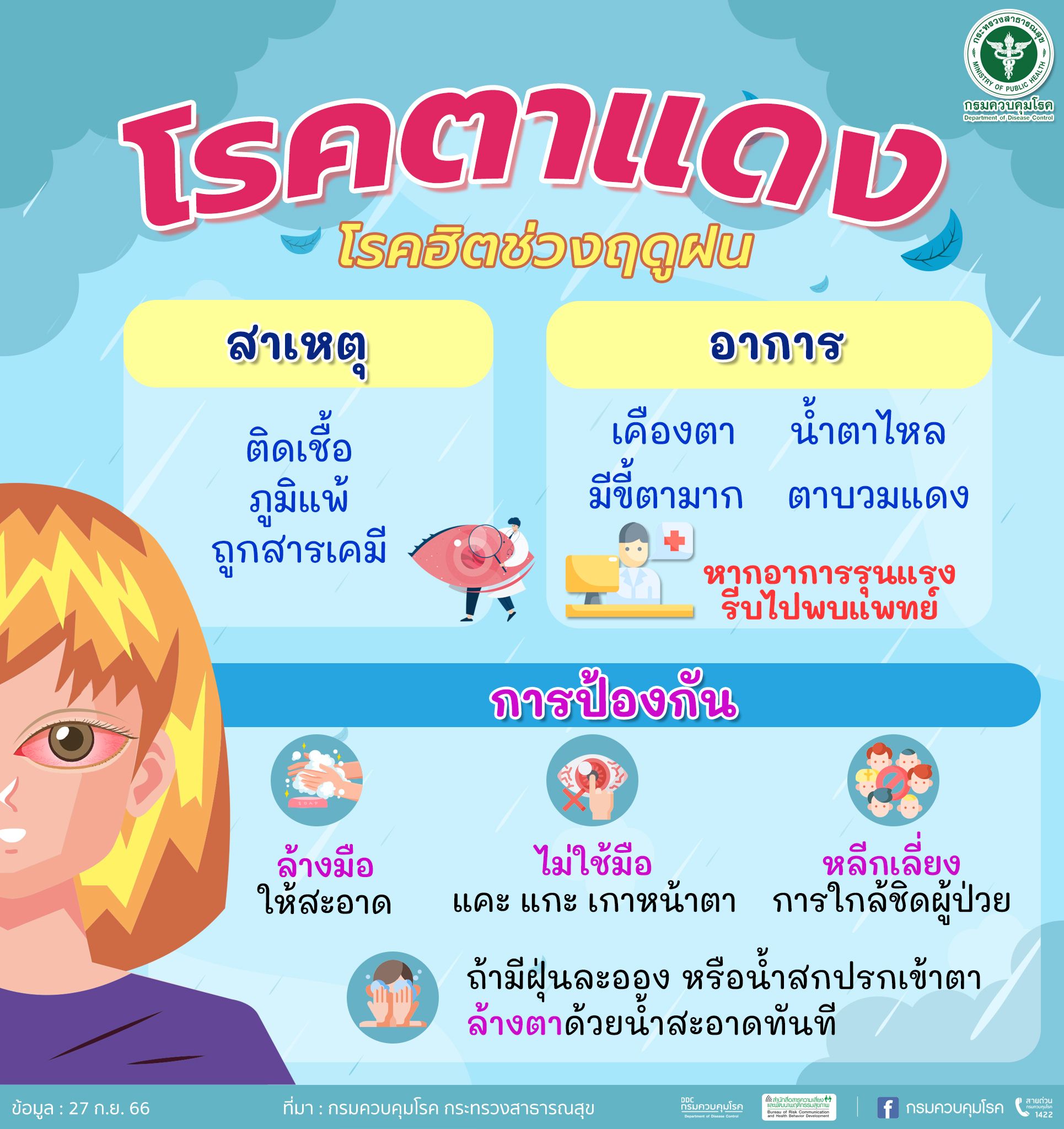จากข้อมูลของกรมควบคุมโรค กระทรวงสาธารณสุข พบว่าในช่วงฤดูฝน โรคที่พบบ่อย คือ โรคตาแดง สามารถติดต่อกันได้อย่างรวดเร็วทั้งในเด็ก และผู้ใหญ่