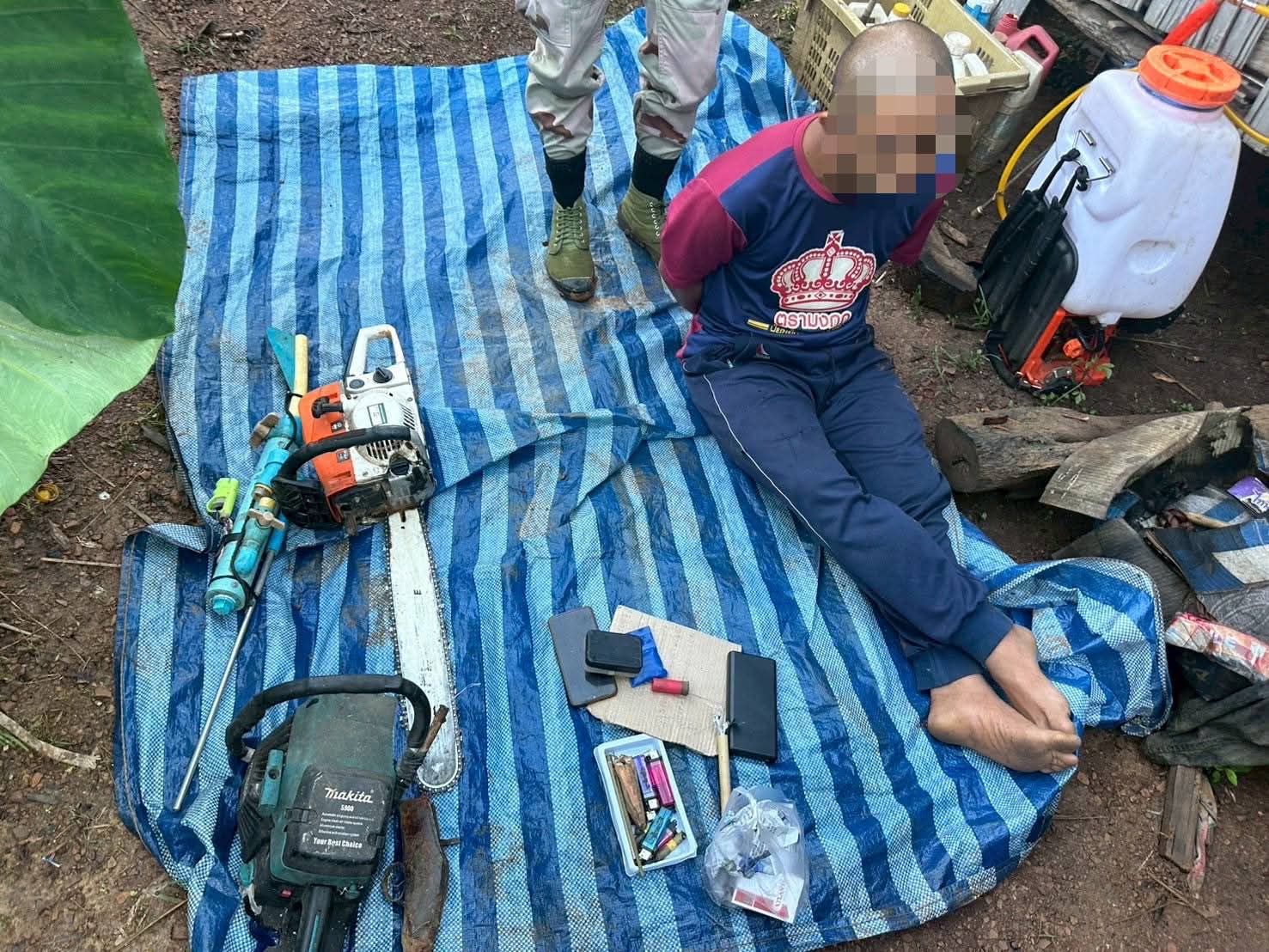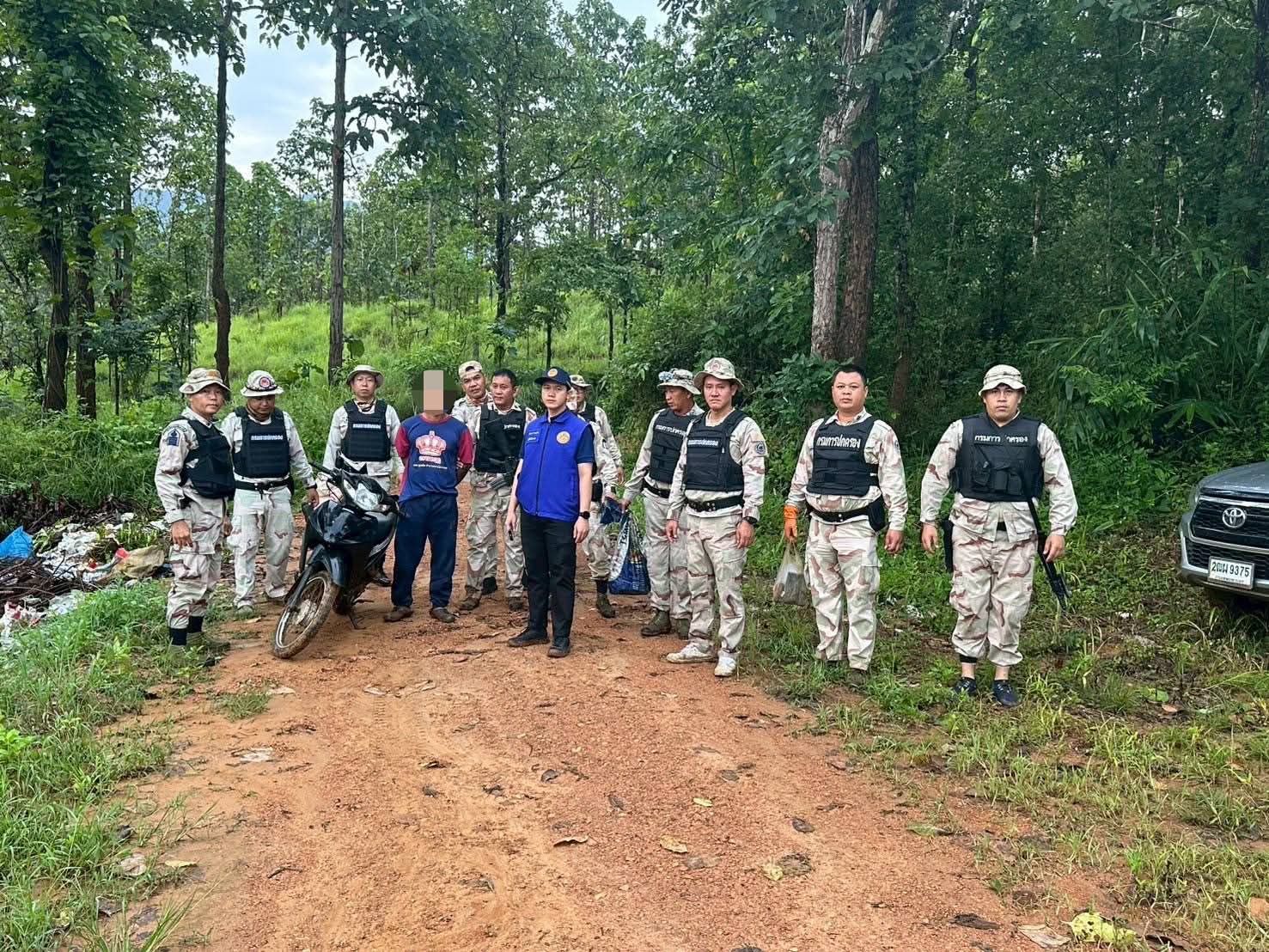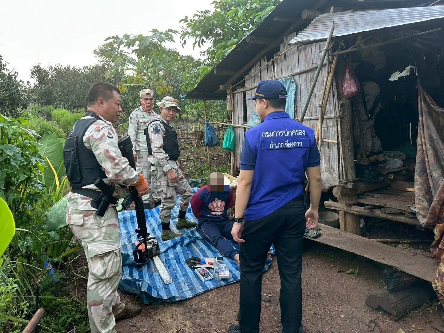 เมื่อเจ้าหน้าที่เดินทางไปถึง พบชายสวมเสื้อยืดสีแดง กางเกงขายาว อยู่ภายในห้างไร่ดังกล่าว เมื่อเห็นเจ้าหน้าที่ ชายคนดังกล่าวแสดงอาการตื่นตระหนก เจ้าหน้าที่จึงเข้าควบคุมตัวและขอตรวจค้น ทราบชื่อภายหลังคือ นายทศพล (ไม่ทราบนามสกุล) อายุ 32 ปี