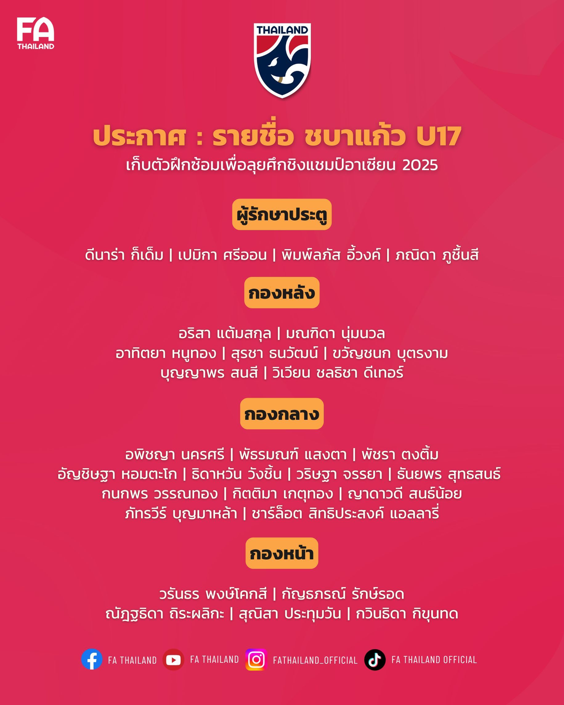 กรุงเทพฯ, 30 กรกฎาคม 2568 – สมาคมกีฬาฟุตบอลแห่งประเทศไทยฯ ได้ประกาศรายชื่อ 28 นักฟุตบอลหญิงทีมชาติไทย รุ่นอายุไม่เกิน 16 ปี เพื่อเข้าเก็บตัวฝึกซ้อมเตรียมความพร้อมก่อนเข้าร่วมการแข่งขันฟุตบอลหญิงชิงแชมป์อาเซียน รุ่นอายุไม่เกิน 16 ปี (2025 ASEAN U-16 Women’s Championship) ที่เมืองสุราการ์ตา ประเทศอินโดนีเซีย ระหว่างวันที่ 18-29 สิงหาคม 2568 นี้