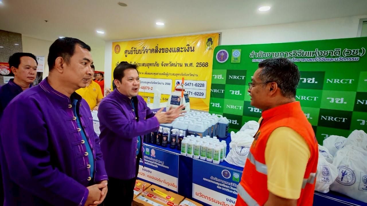 อุปกรณ์ และผลิตภัณฑ์นวัตกรรมจากงานวิจัย แก่ผู้ประสบภัยน้ำท่วมในจังหวัดน่านที่รับมอบในครั้งนี้ เป็น ผลงานวิจัยของ ศาสตราจารย์ดร.สนอง เอกสิทธิ์ ภาควิชาเคมี คณะวิทยาศาสตร์ จุฬาลงกรณ์มหาวิทยาลัย ผลงาน “Agent29: คอปเปอร์นาโนรูปเข็ม “ เพื่อป้องกันเชื้อราหลังน้ำท่วม สำหรับปูนซีเมนต์ ไม้ ฝาเพดาน พรม ผ้า ฟองน้ำ และรถยนต์ พร้อมทั้งรับบมอบถุงยังชีพและที่นอนยางพารา เพื่อ นำไปมอบให้กับพี่น้องประชาชนที่ประสบอุทกภัยในจังหวัดน่านต่อไป