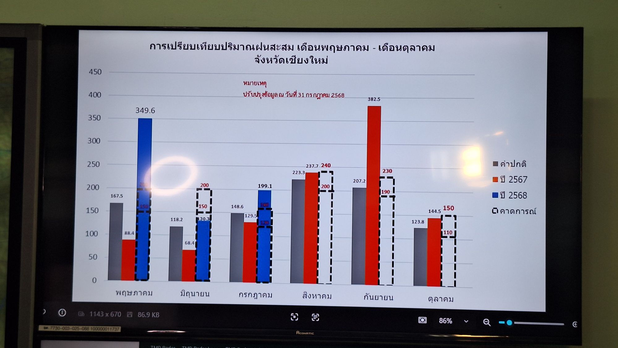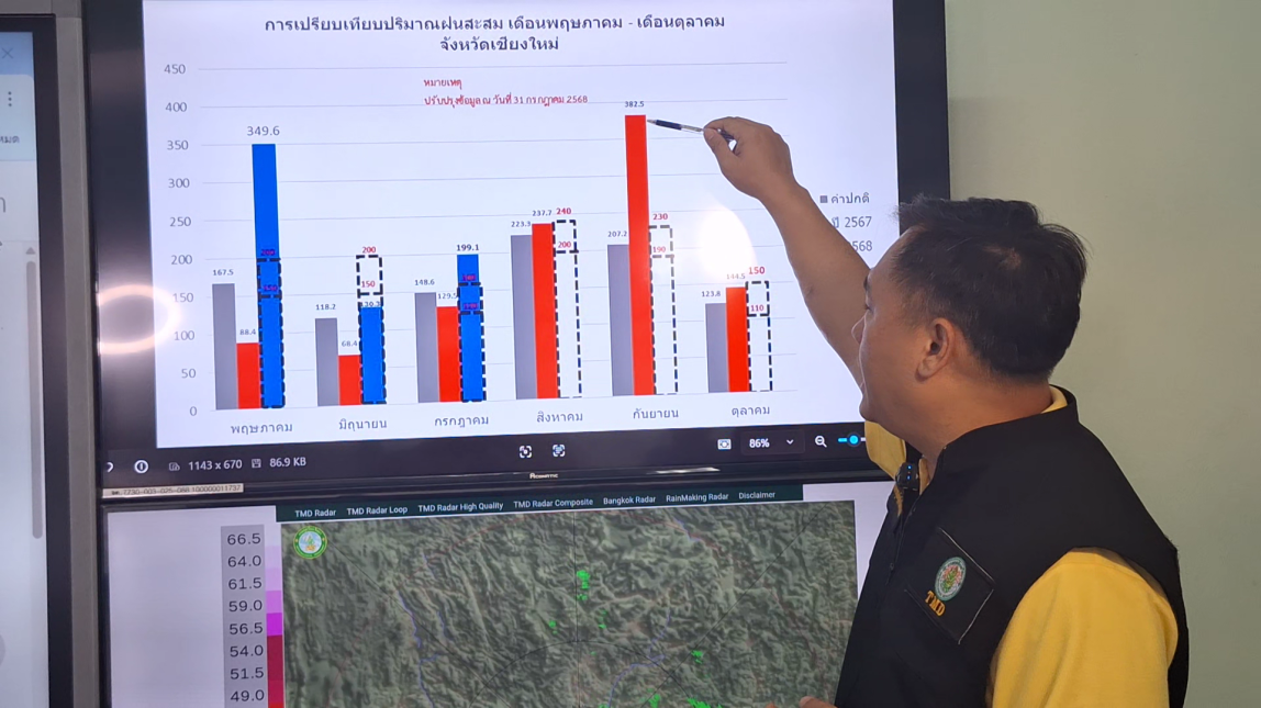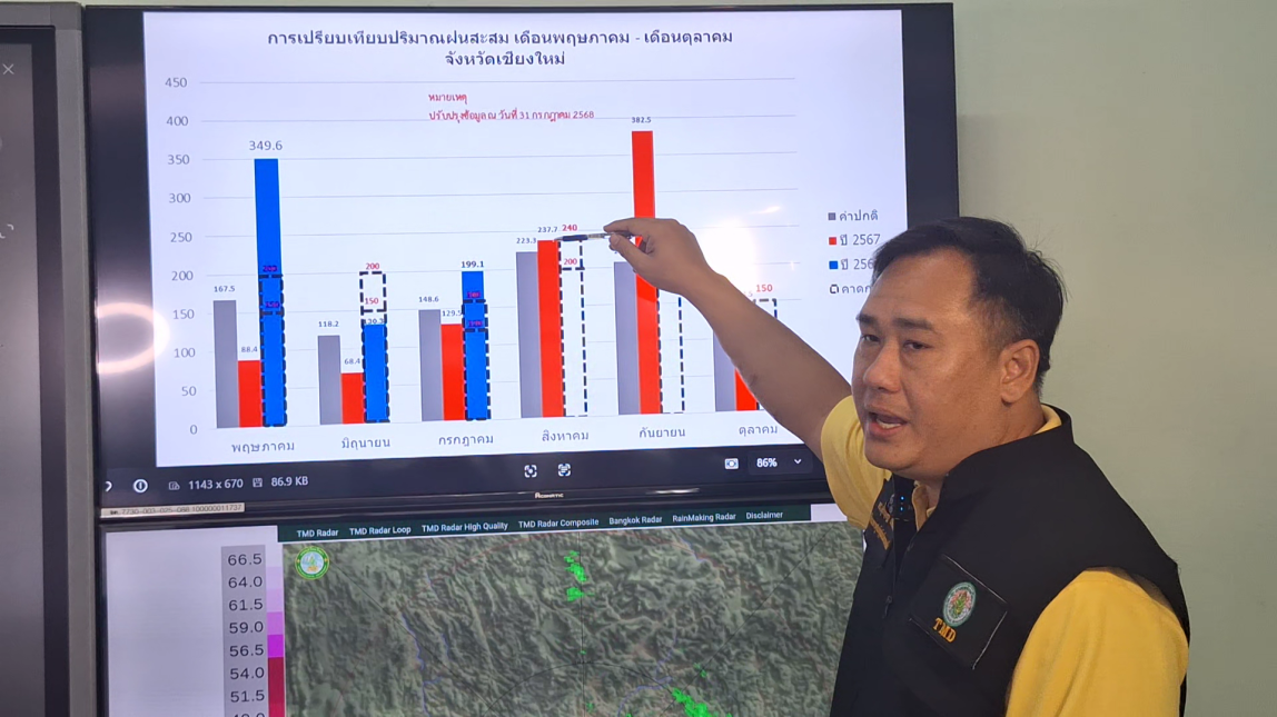 “สถานการณ์ฝนในเดือนสิงหาคมปีนี้ฝนที่คาดการณ์ไว้จะมีปริมาณใกล้เคียงกับค่าปกติซึ่งมีค่าอยู่ที่ 223 มม. ใกล้เคียงกับฝนปีที่แล้ว (ปี 2567) ก็คาดว่าปริมาณฝนอยู่ที่ 240 มม. แต่พอเข้าเดือนกันยายนคาดการณ์ว่าปริมาณฝนจะใกล้เคียงกับค่าปกติ (207.2 มม.) หรือมากกว่าค่าปกติเล็กน้อย คาดการณ์ไว้ว่าปริมาณฝนจะอยู่ที่ 230 มม. ซึ่งจะน้อยกว่าปีที่แล้ว ซึ่งปีที่แล้วฝนเชียงใหม่มีปริมาณที่มากกว่าปกติ ปริมาณอยู่ที่ 382.5 มม. ซึ่งยังอยู่ในเกณฑ์ที่ควบคุมได้ แต่อย่างไรก็ตามในช่วงปลายฤดูฝน ช่วงปลายเดือนกันยายนต่อเนื่องเดือนตุลาคมกรมอุตุนิยมวิทยาคาดการณ์ว่าจะมีพายุเคลื่อนเข้าประเทศไทย 1-2 ลูก ก็อาจต้องเฝ้าระวังในช่วงนั้น รวมถึงช่วง 2 สัปดาห์สุดท้ายของเดือนสิงหาคมต่อเนื่องเดือนกันยายนร่องมรสุมจะกลับลงมาพาดผ่านภาคเหนือ ซึ่งจะทำให้ฝนมีปริมาณเพิ่มมากขึ้น” ดร.สุกฤษฎิ์ฯ กล่าว