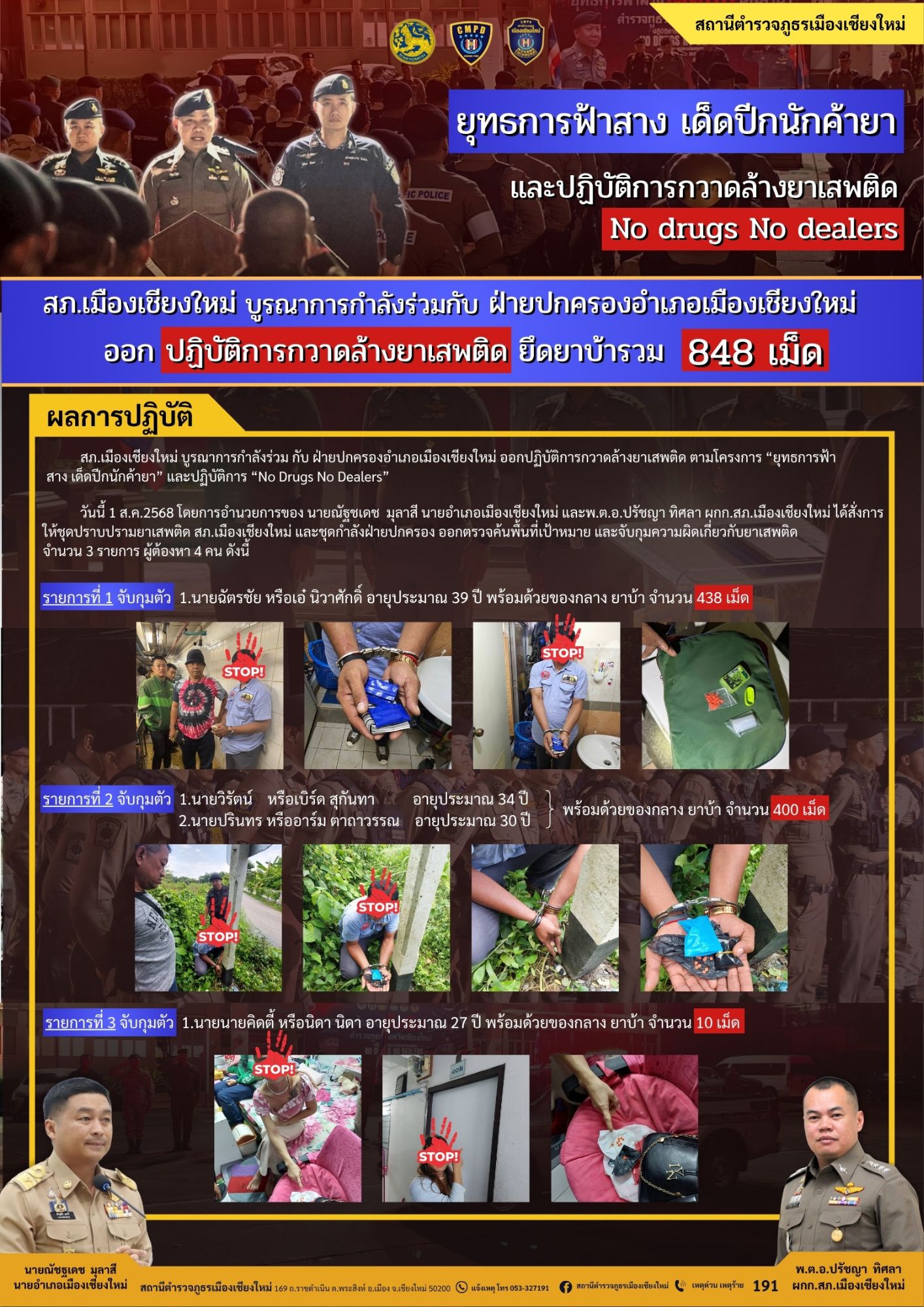จากการสืบสวนและเข้าตรวจค้นพื้นที่เป้าหมาย พ.ต.อ.ปรัชญา ทิศลา ผู้กำกับการ สภ.เมืองเชียงใหม่ พร้อมทีมปราบปรามยาเสพติดและฝ่ายปกครอง สามารถจับกุมผู้ค้ายาเสพติดได้ 3 ราย ผู้ต้องหา 4 คน พร้อมของกลางยาบ้ารวมกันกว่า 848 เม็ด