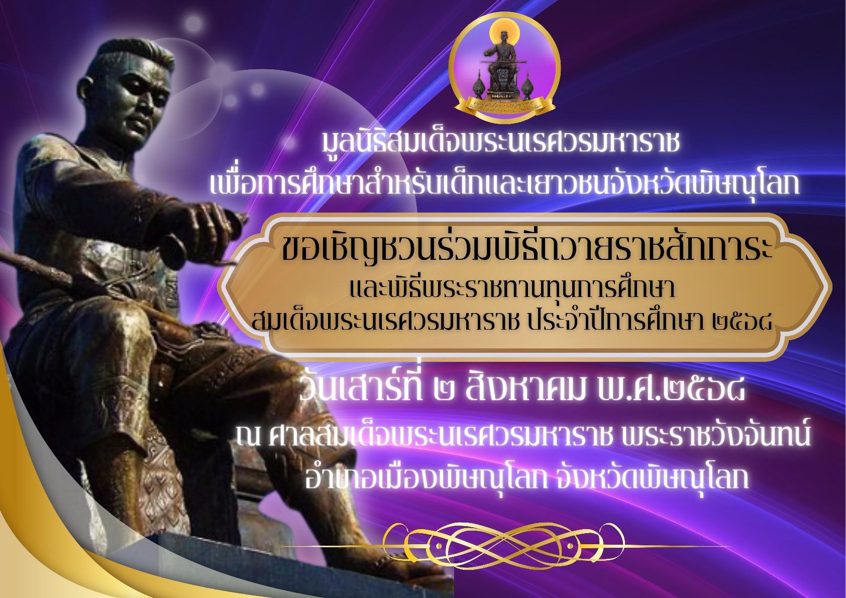 สำหรับในปีนี้ทางมูลนิธิสมเด็จพระนเรศวรมหาราช ได้พระราชทานทุนการศึกษาสำหรับเด็กและเยาวชนจังหวัดพิษณุโลก ประจำปีการศึกษา 2568 ให้แก่มีผู้ที่มีคุณสมบัติที่คณะกรรมการมูลนิธิกำหนด คือ เป็น “คนเก่ง คนดี” ได้รับการคัดเลือกให้ได้รับพระราชทานทุนแบบต่อเนื่อง (ทุนหลัก) ทุนละ 85,000 บาท/ปี จนสำเร็จการศึกษาระดับปริญญาตรี 3 ทุน ประกอบด้วย
