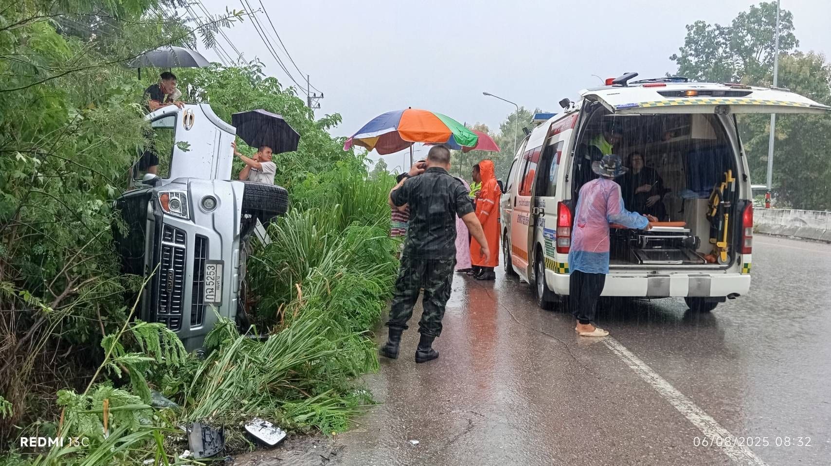 รถยนต์คันดังกล่าวซึ่งมีผู้โดยสารทั้งหมด 5 คน เป็นชาวเชียงราย กำลังมุ่งหน้าไปร่วมงานศพที่ อ.แม่เมาะ จ.ลำปาง แต่เนื่องจากสภาพอากาศที่มีฝนตกและถนนลื่น ทำให้รถเสียหลักไถลตกลงข้างทางอย่างรุนแรง ส่งผลให้ผู้โดยสารทั้ง 5 คนได้รับบาดเจ็บ มีทั้งแผลถลอก, ศีรษะแตก และแขนหัก