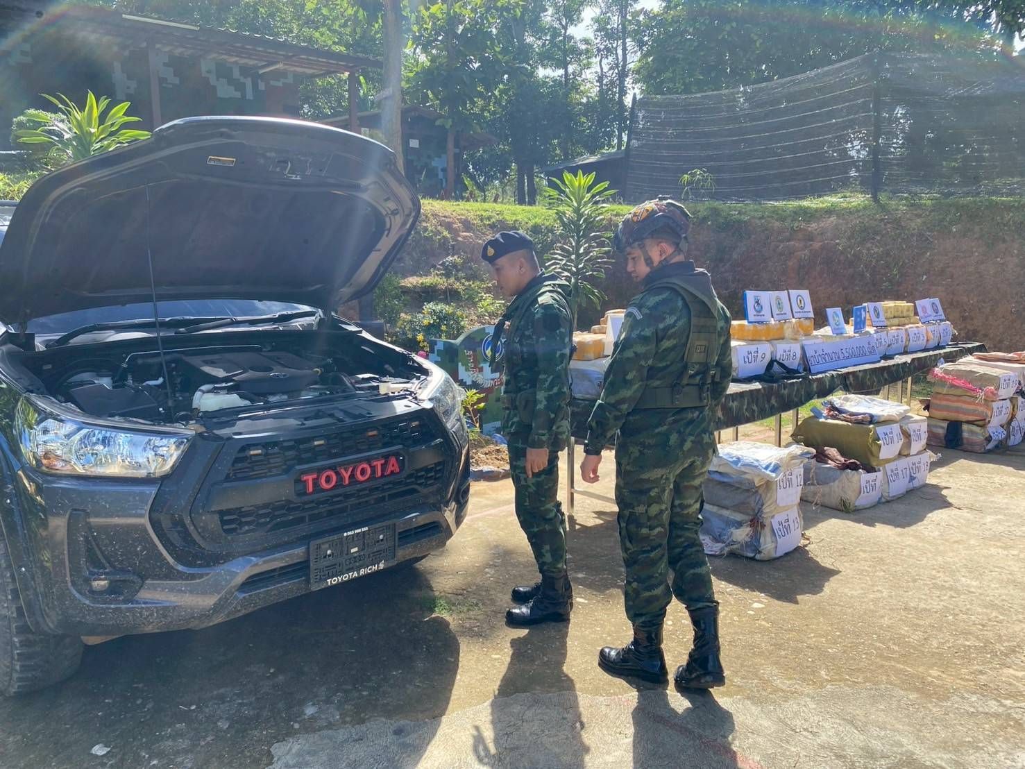 ต่อมาเมื่อ เวลา 21.45 น. ได้ตรวจพบ รถยนต์ (กระบะ) ยี่ห้อ โตโยต้า รุ่น ไฮลักซ์ รีโว่ สีดำ ไม่ติดแผ่นป้ายทะเบียน ขับมาตามเส้นทางดังกล่าว หน่วยจึงได้แสดงตัวเพื่อขอทำการตรวจค้น แต่รถยนต์คันดังกล่าวได้หยุดรถก่อนถึงจุดตรวจ ประมาณ 200 เมตร จากนั้นชายต้องสงสัย จำนวน 3 ราย ได้ลงจากรถ และอาศัยความชำนาญในพื้นที่วิ่งหลบหนีไป จากการตรวจสอบรถยนต์คันดังกล่าว พบกระสอบดัดแปลงเป็นเป้สะพายหลัง จำนวน 30 กระสอบ วางอยู่ท้ายกระบะรถยนต์ ภายในบรรจุยาเสพติดให้โทษประเภท 1 (ยาบ้า)กระสอบละ 200,000 เม็ด จำนวน 25 กระสอบ รวมประมาณ 5,000,000 เม็ด และกระสอบละ 100,000 เม็ด รวมประมาณ 500,000 เม็ด รวมทั้งสิ้นประมาณ 5,500,000 เม็ด