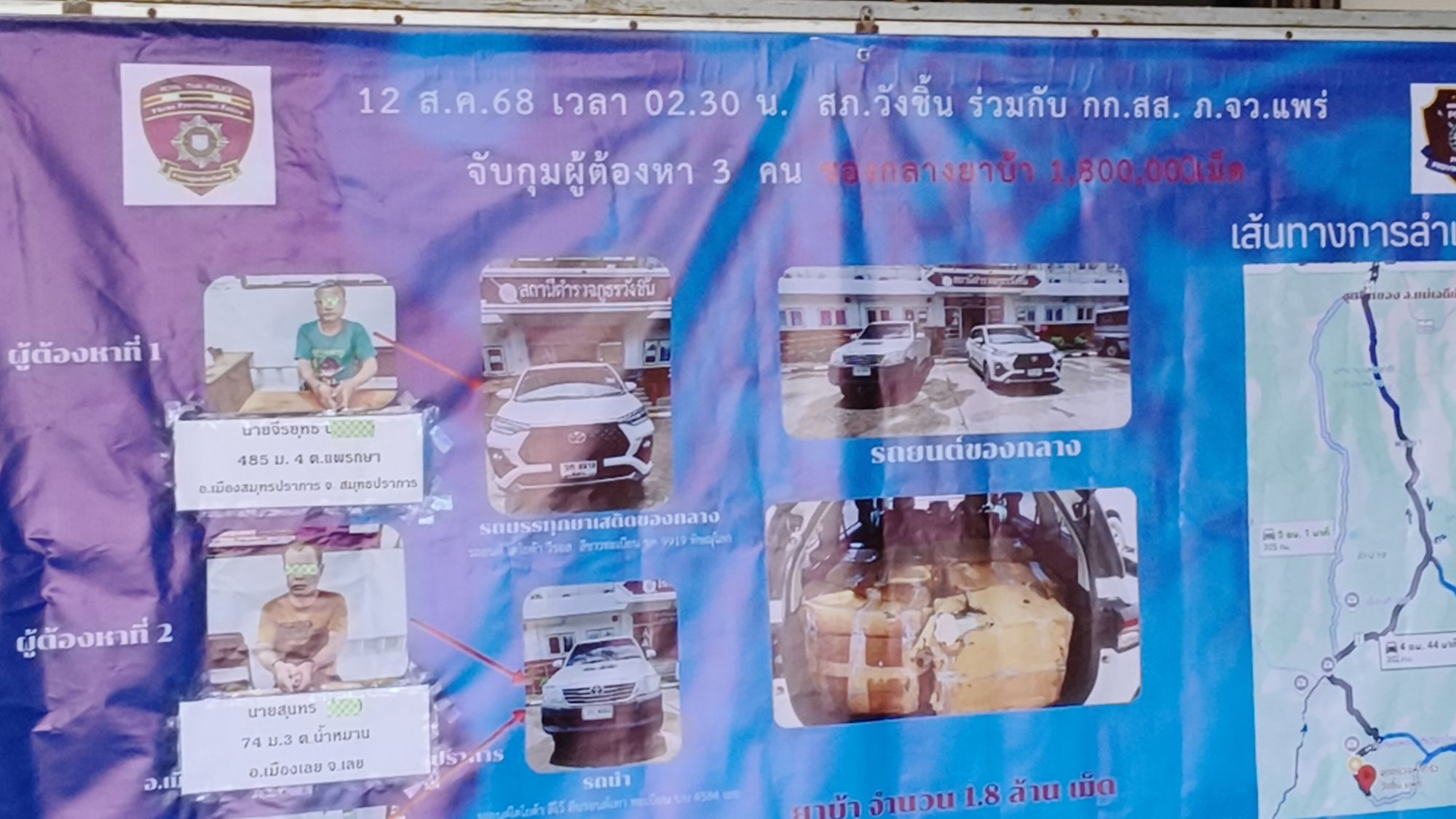 เจ้าหน้าที่ตำรวจ สภ.วังชิ้น จ.แพร่ ได้ตั้งด่านตรวจและสามารถสกัดจับรถยนต์ต้องสงสัย 2 คัน ที่ขับตามกันมาได้ พร้อมกับควบคุมตัวผู้ต้องหา 3 คน คือ นายอำพร อายุ 48 ปี, นายจิรยุทธ อายุ 40 ปี และนายสุนทร อายุ 46 ปี จากการตรวจค้นรถคันหนึ่งพบยาบ้าซุกซ่อนอยู่จำนวน 1,800,000 เม็ด โดยทั้งหมดให้การรับสารภาพว่ารับจ้างขนยาเสพติดไปส่งที่กรุงเทพมหานคร