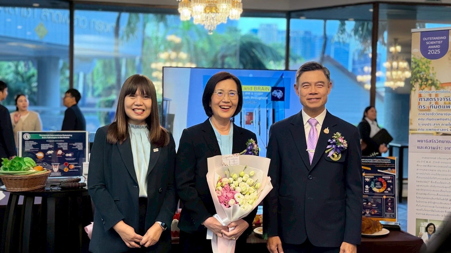 เมื่อวันที่ 13 สิงหาคม 2568 ณ โรงแรมเซ็นทารา แกรนด์ แอท เซ็นทรัลพลาซา ลาดพร้าว กรุงเทพมหานคร ผศ.ดร.นพ.ภาสกร สวัสดิรักษ์ รองผู้อำนวยการโรงพยาบาลมหาราชนครเชียงใหม่ ผู้แทน รศ.นพ.นเรนทร์ โชติรสนิรมิต คณบดีคณะแพทยศาสตร์ มช. มอบช่อดอกไม้แสดงความยินดี ศ.(เชี่ยวชาญพิเศษ) ดร. ทพญ.สิริพร ฉัตรทิพากร หัวหน้าหน่วยสรีรวิทยาระบบประสาท ภายใต้ศูนย์วิจัยและฝึกอบรมสาขาโรคทางไฟฟ้าของหัวใจ คณะแพทยศาสตร์ มช. เป็นผู้ที่ได้รับรางวัล “นักวิทยาศาสตร์ดีเด่น ประจำปี พ.ศ.2568”