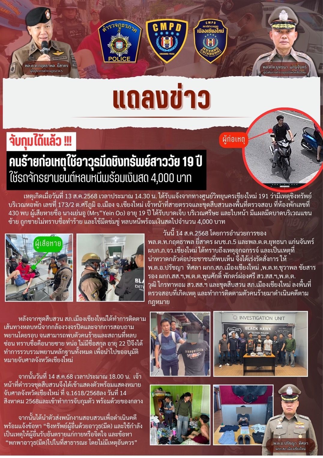 เหตุเกิดเมื่อวันที่ 13 ส.ค.2568 เวลาประมาณ 14.30 น. ได้รับแจ้งจากทางศูนย์วิทยุนครเชียงใหม่ 191 ว่ามีเหตุชิงทรัพย์ บริเวณหอพัก เลขที่ 173/2 ต.ศรีภูมิ อ.เมือง จ.เชียงใหม่ เจ้าหน้าที่สายตรวจและชุดสืบสวนลงพื้นที่ตรวจสอบ ที่ห้องพักเลขที่ 430 พบ ผู้เสียหายชื่อ นางเย่นอู (Mrs”Yein Oo) อายุ 19 ปี ได้รับบาดเจ็บ บริเวณศรีษะ และใบหน้า มีแผลมีดบาดบริเวณแขนซ้าย ถูกชายไม่ทราบชื่อทำร้าย และใช้มีดข่มขู่ หลบหนีพร้อมเงินสดไปจำนวน 4,000 บาท