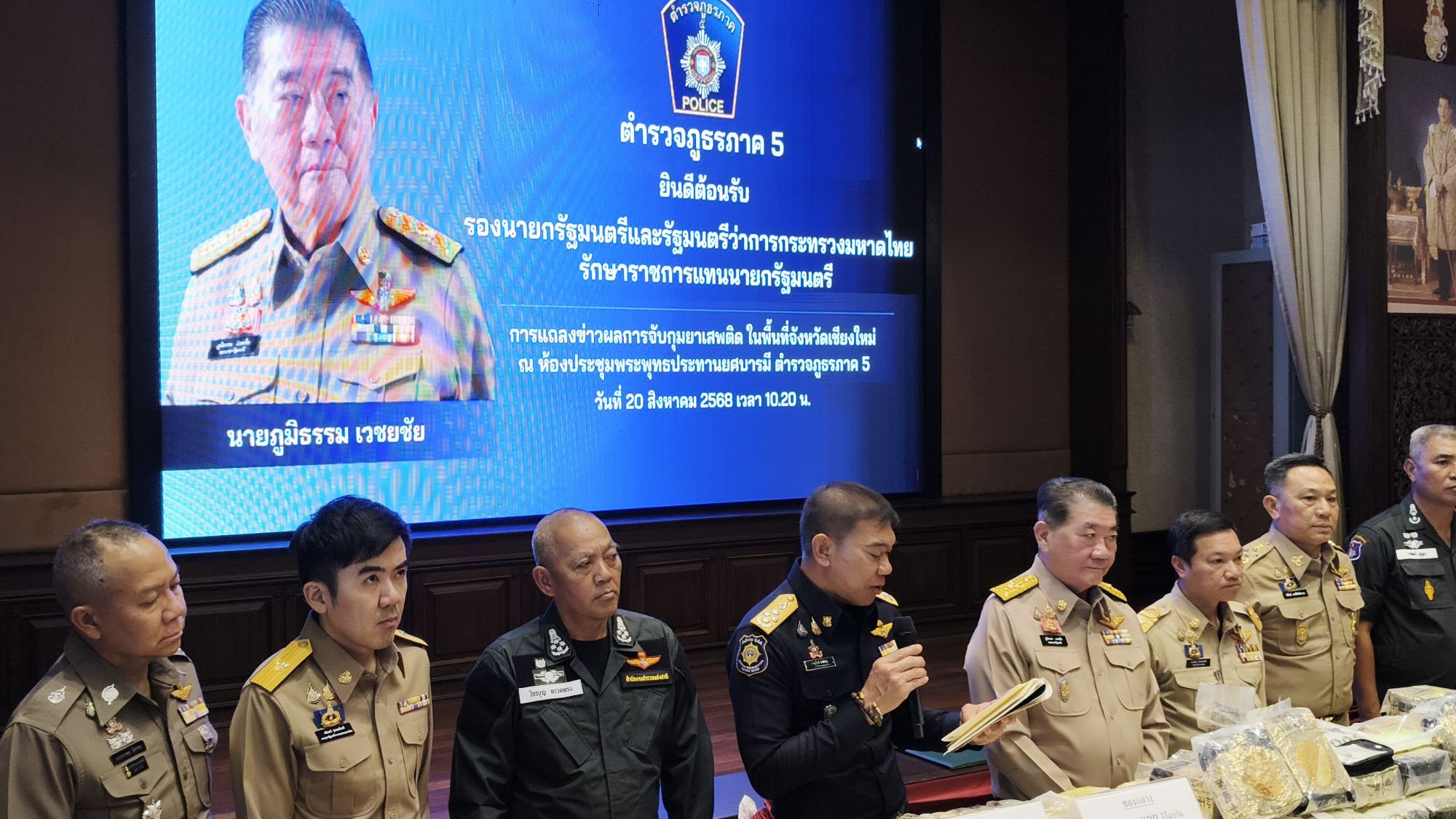 เชียงใหม่ – เมื่อวันที่ 20 สิงหาคม 2568 ที่ห้องประชุมพระพุทธประทานยศบารมี ตำรวจภูธรภาค 5 อ.เมืองเชียงใหม่ จ.เชียงใหม่ นายภูมิธรรม เวชยชัย รองนายกรัฐมนตรีและรัฐมนตรีว่าการกระทรวงมหาดไทย รักษาราชการแทนนายกรัฐมนตรี เป็นประธานการแถลงข่าวเจ้าหน้าที่ตำรวจภูธรภาค 5 และหน่วยงานที่เกี่ยวข้อง ในการปฏิบัติการยึดไอซ์ล็อตใหญ่กว่า 700 กิโลกรัม ที่ถูกซุกซ่อนไว้ในสวนลำไยในพื้นที่อำเภอเชียงดาว จังหวัดเชียงใหม่ พร้อมมอบนโยบายปราบยาเสพติดเข้มข้น ชื่นชมทุกภาคส่วนดำเนินการมาตรการ “Seal Stop Safe” และตรวจเยี่ยมแผนการป้องกันน้ำท่วมและย้ายที่ทำการตำรวจภูธรภาค 5 โดยมี พล.ต.อ.ไกรบุญ ทรวดทรง รองผู้บัญชาการตำรวจแห่งชาติ ( รอง ผบ.ตร. ), พล.ต.ท. ภาณุรัตน์ หลักบุญ เลขาธิการ ป.ป.ส., นายนิรัตน์ พงษ์สิทธิถาวร อธิบดีกรมการปกครอง,พล.ต.ท.กฤตธาพล ยี่สาคร ผู้บัญชาการตำรวจภูธรภาค 5. และคณะเจ้าหน้าที่หน่วยงานที่เกี่ยวข้องทุกภาคส่วนเข้าร่วมแถลงข่าวพร้อมรับมอบนโยบายในครั้งนี้