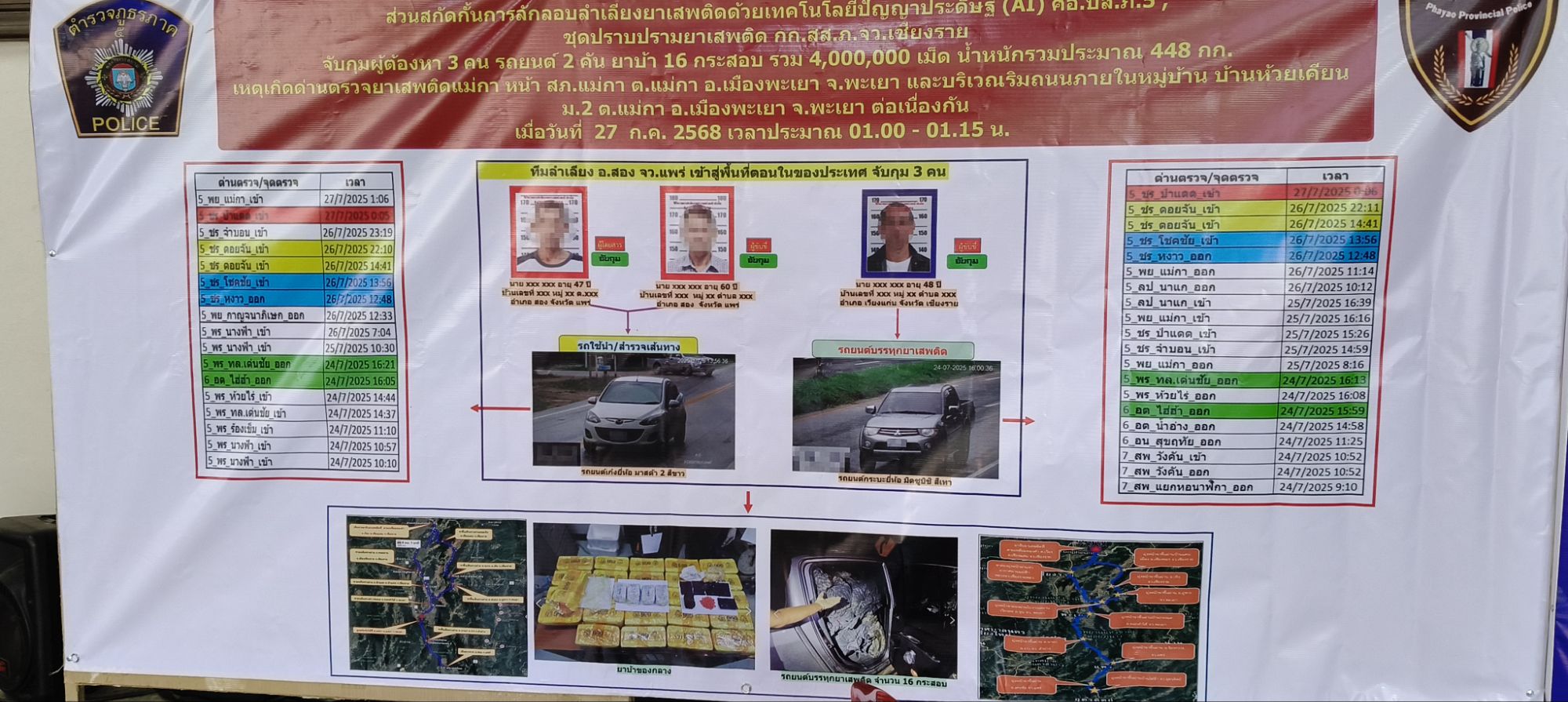 คดีที่ 1: ด่านแม่กา จ.พะเยา ยึดยาบ้า 4 ล้านเม็ด วันที่ 27 กรกฎาคม 2568 เจ้าหน้าที่ตำรวจ สภ.แม่กา ได้ตั้งด่านสกัดและติดตามรถยนต์ต้องสงสัย หลังได้รับแจ้งเบาะแสจาก ศอ.ปส.ภ.5 ว่าจะมีการลักลอบขนยาเสพติดเข้าพื้นที่ โดยสามารถสกัดรถยนต์ได้ 2 คัน และจับกุมผู้ต้องหา 3 คน คือ นายก้องกังวาลฯ, นายนาถจักษ์ฯ, และนายอนุชาฯ พร้อมของกลางยาบ้าที่ซุกซ่อนในรถกระบะจำนวน 4 ล้านเม็ด
