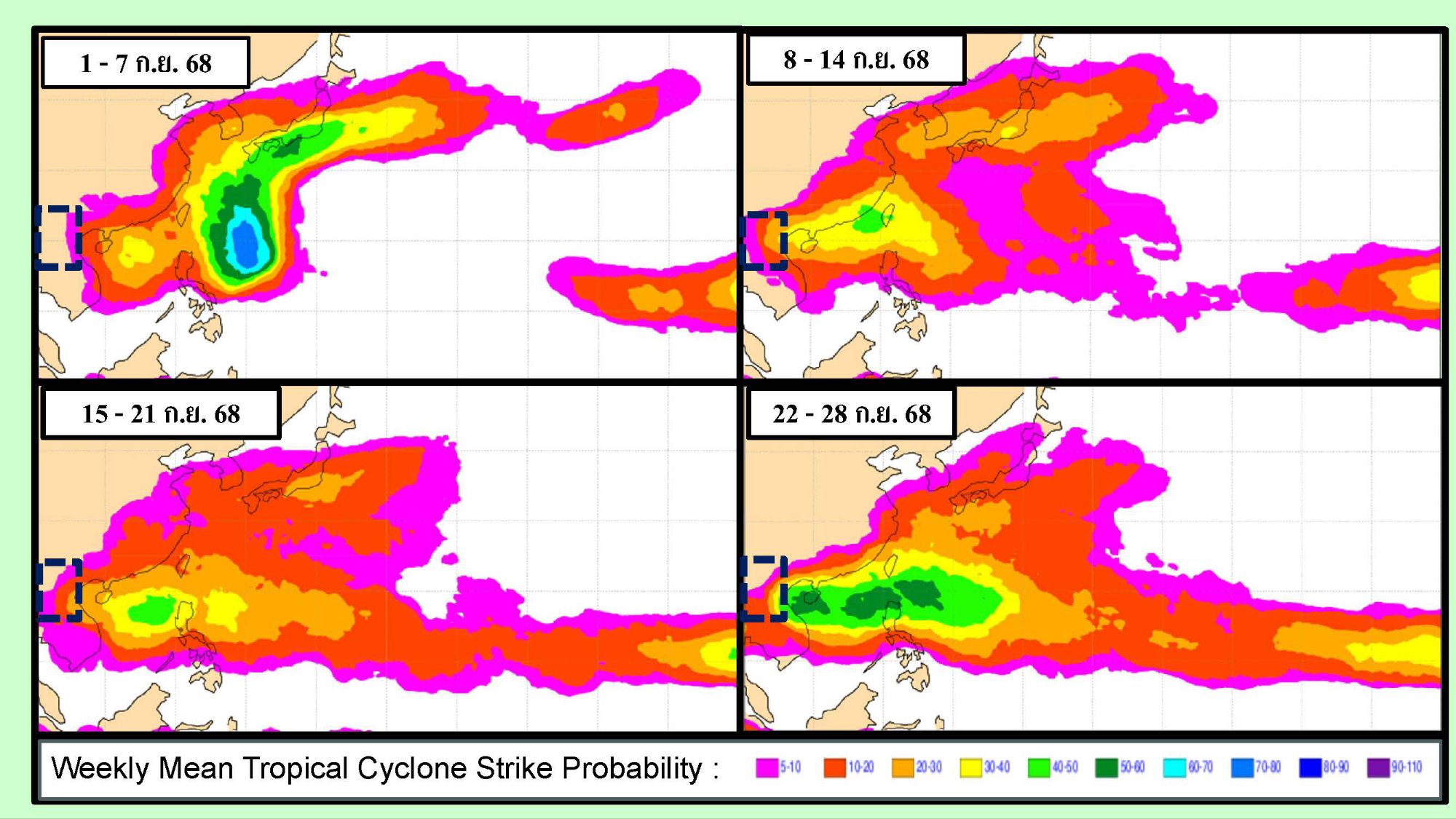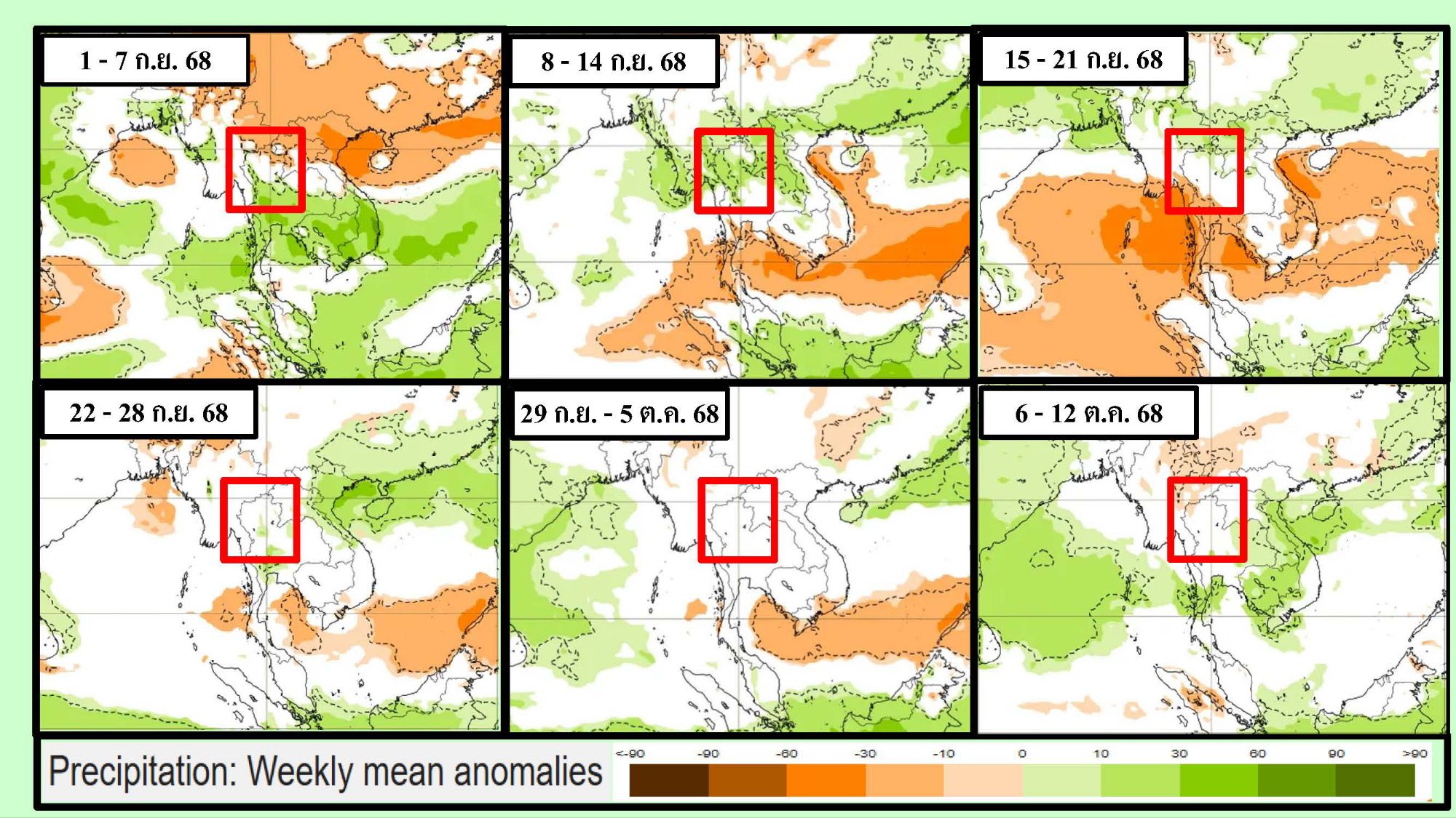 ดร.สุกฤษฎิ์ฯ กล่าวอีกว่า หากมาดูฝนเป็นรายสัปดาห์ในช่วงเดือนกันยายน จะพบว่า ช่วงสัปดาห์แรกตอนบนๆ ซึ่งโมเดลให้สีออกเป็นโทนร้อน สื่อได้ว่าฝนจะใกล้เคียงกับค่าปกติ ส่วนสีโทนเย็นฝนจะใกล้เคียงกับค่าปกติ ซึ่งจะเห็นได้ว่าสัปดาห์แรกตอนบนๆ ฝนจะน้อยกว่าค่าปกติ ส่วนตอนล่างๆ จะมากกว่าค่าปกติเล็กน้อย ตอนกลางของจังหวัดจะใกล้เคียงกับค่าปกติ ภาพรวมในช่วงต้นเดือนกันยายนฝนจะมีปริมาณใกล้เคียงกับค่าปกติ