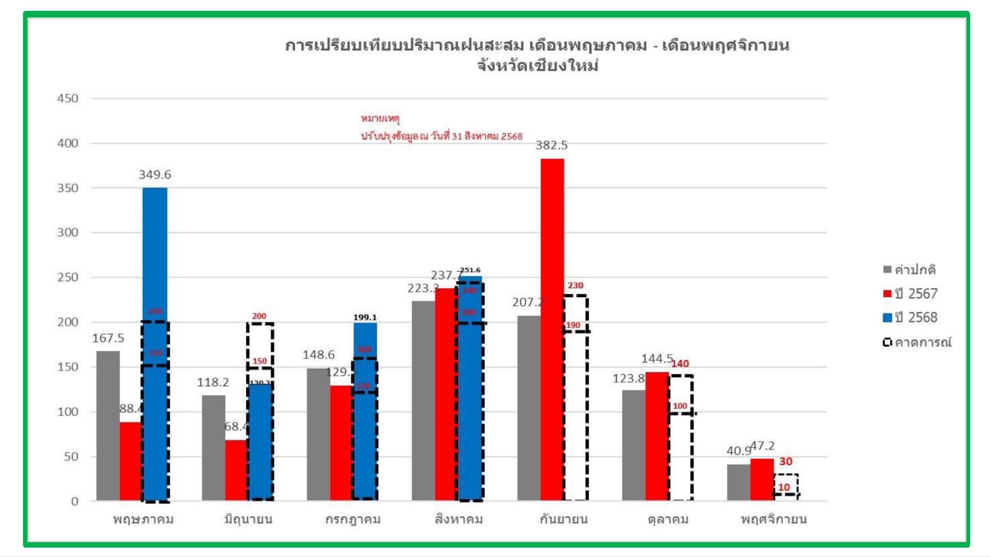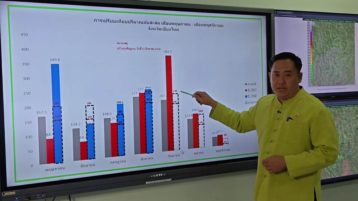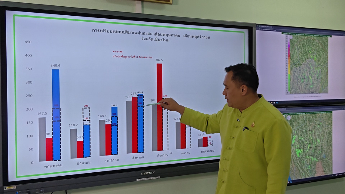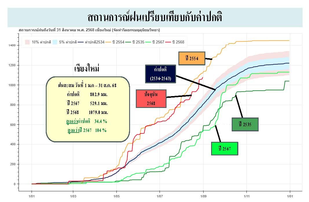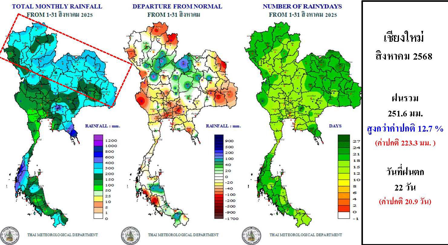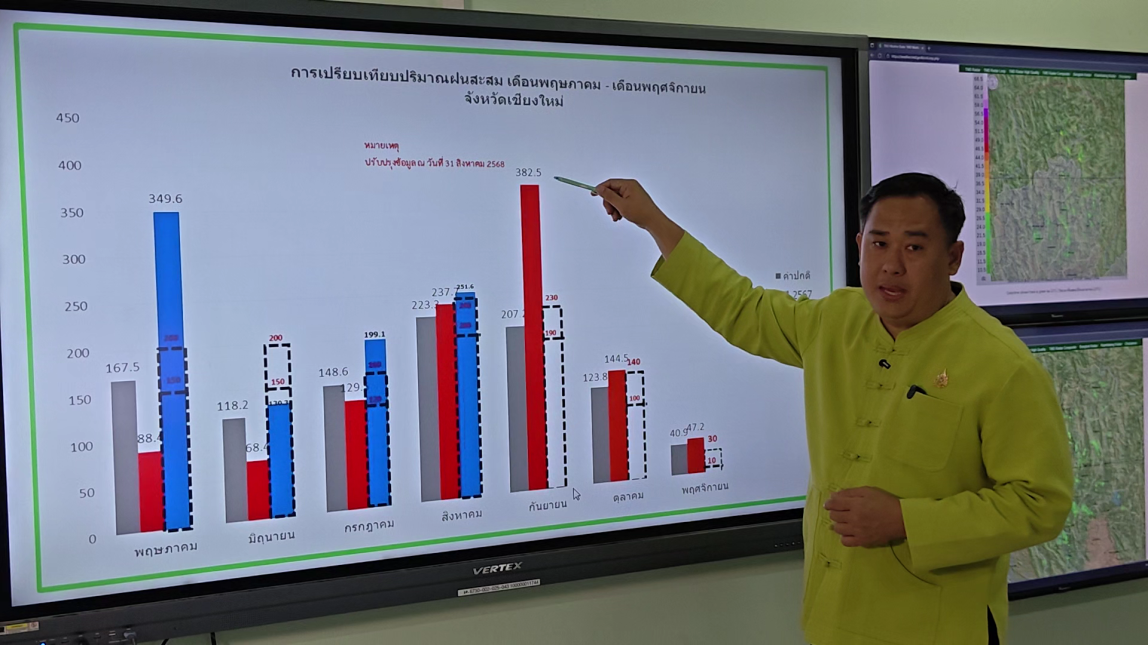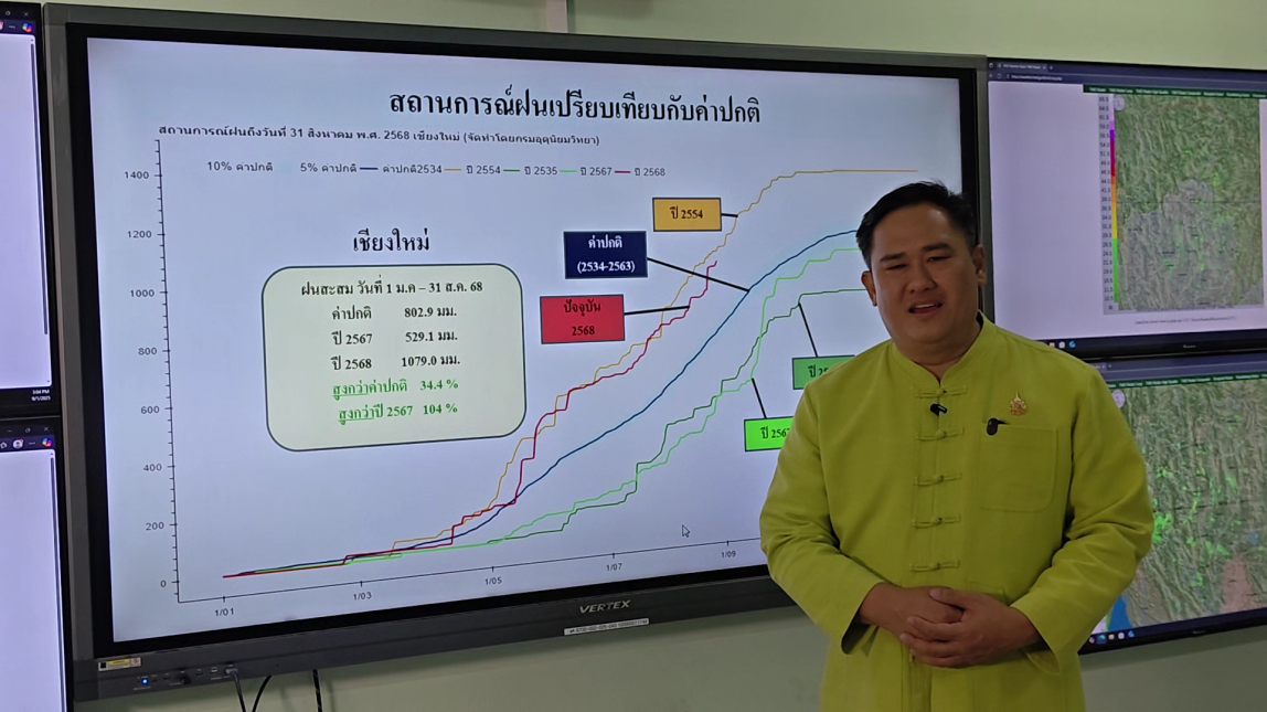 “เฉพาะเดือนสิงหาคม 2568 ฝนจะเกิดในช่วงตอนบนๆ ของภาคเหนือ ได้แก่ จ.เชียงราย น่าน พะเยา ส่วนเชียงใหม่ฝนก็จะมากในช่วงตอนบนของจังหวัด ซึ่งเป็นบริเวณต้นน้ำปิงและต้นน้ำกก เฉพาะเดือนสิงหาคมจังหวัดเชียงใหม่มีฝนรวมอยู่ที่ 251.6 มม. สูงกว่าค่าปกติ 12.7% เดือนสิงหาคมมี 31 วัน มีวันที่ฝนตกทั้งหมด 22 วัน เมื่อพิจารณาจากกราฟพยากรณ์ซึ่งคาดการณ์ไว้ว่าฝนจะอยู่ในช่วง 200 – 240 มม. แต่ช่วงเดือนสิงหาคมตรวจวัดฝนรวมได้ 251.6 มม.”